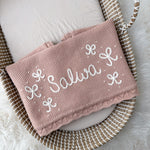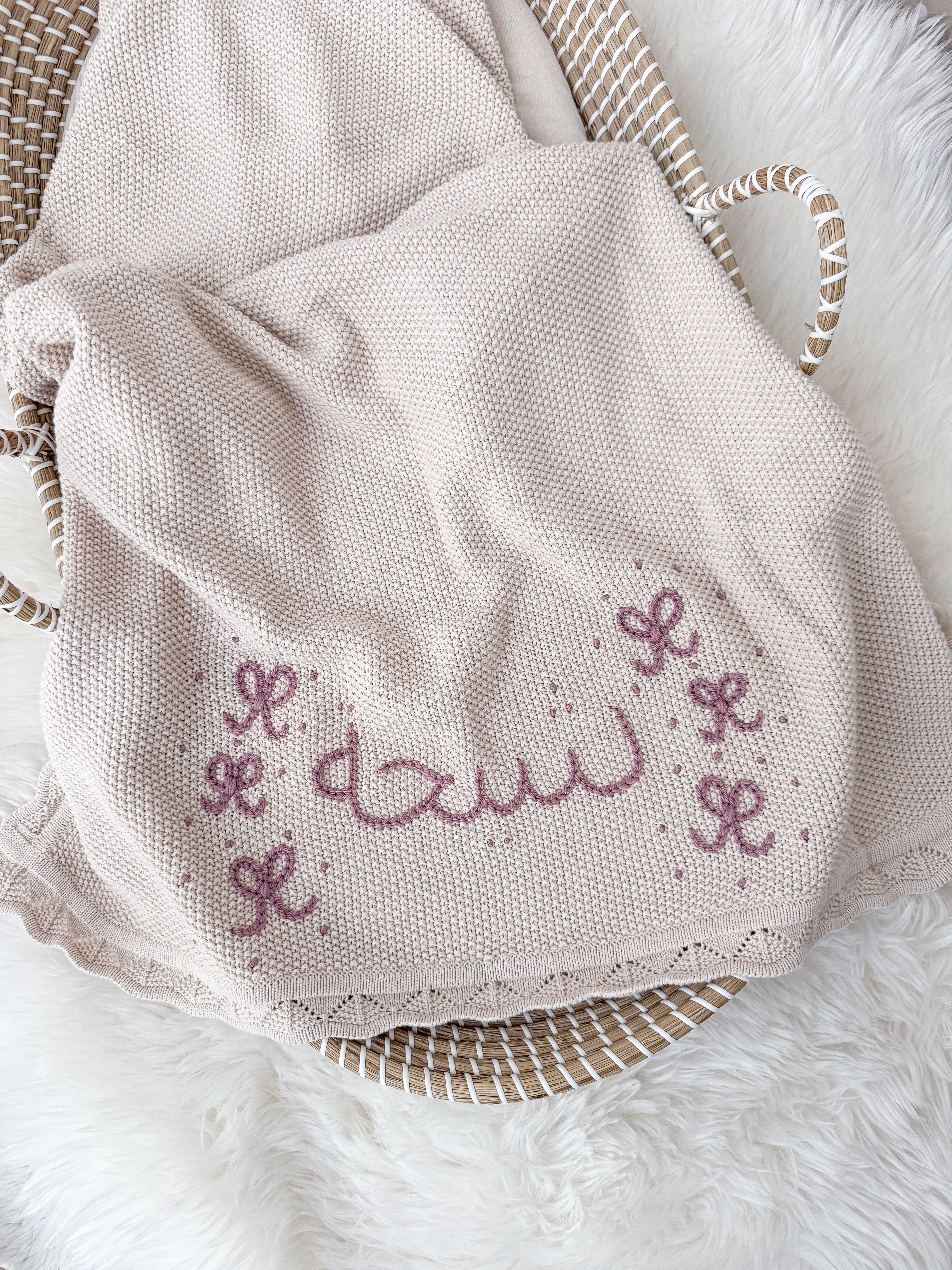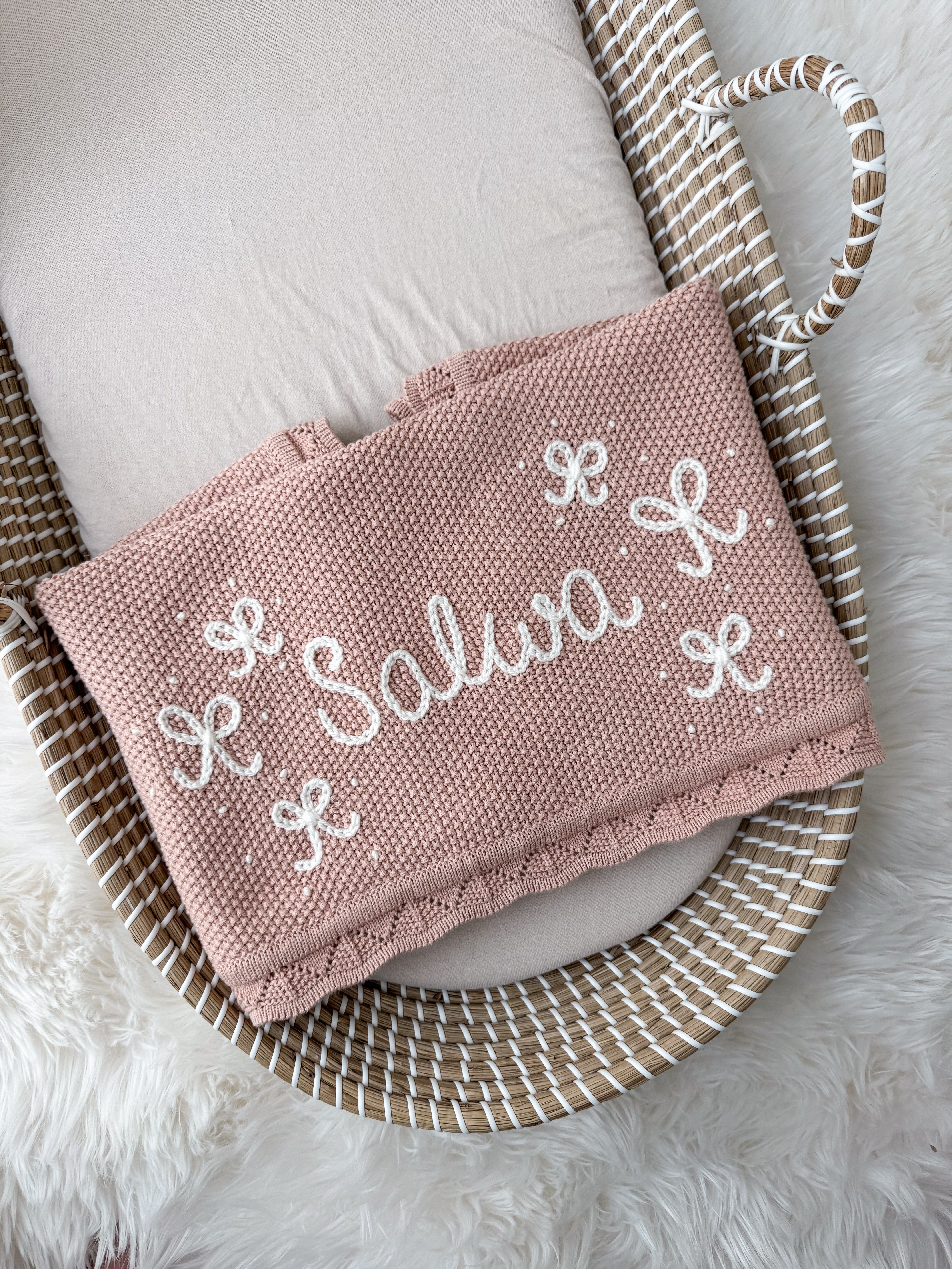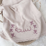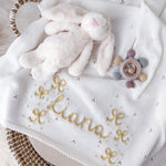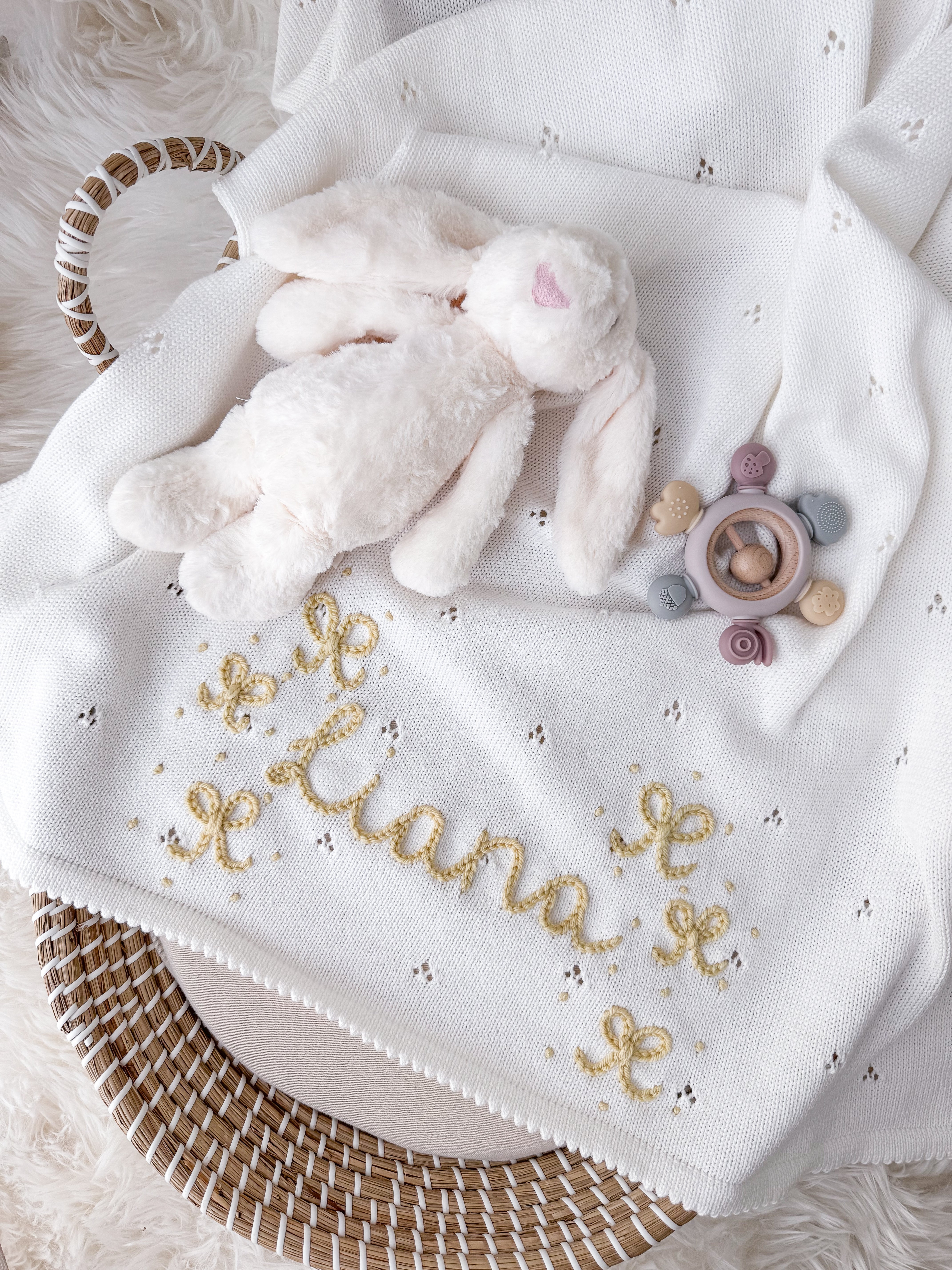 Names are hand-embroidered and are sewn along the bottom centre of the blanket, if you would like the name to be placed in another position on the blanket, please let us know in order notes box below.