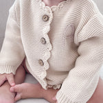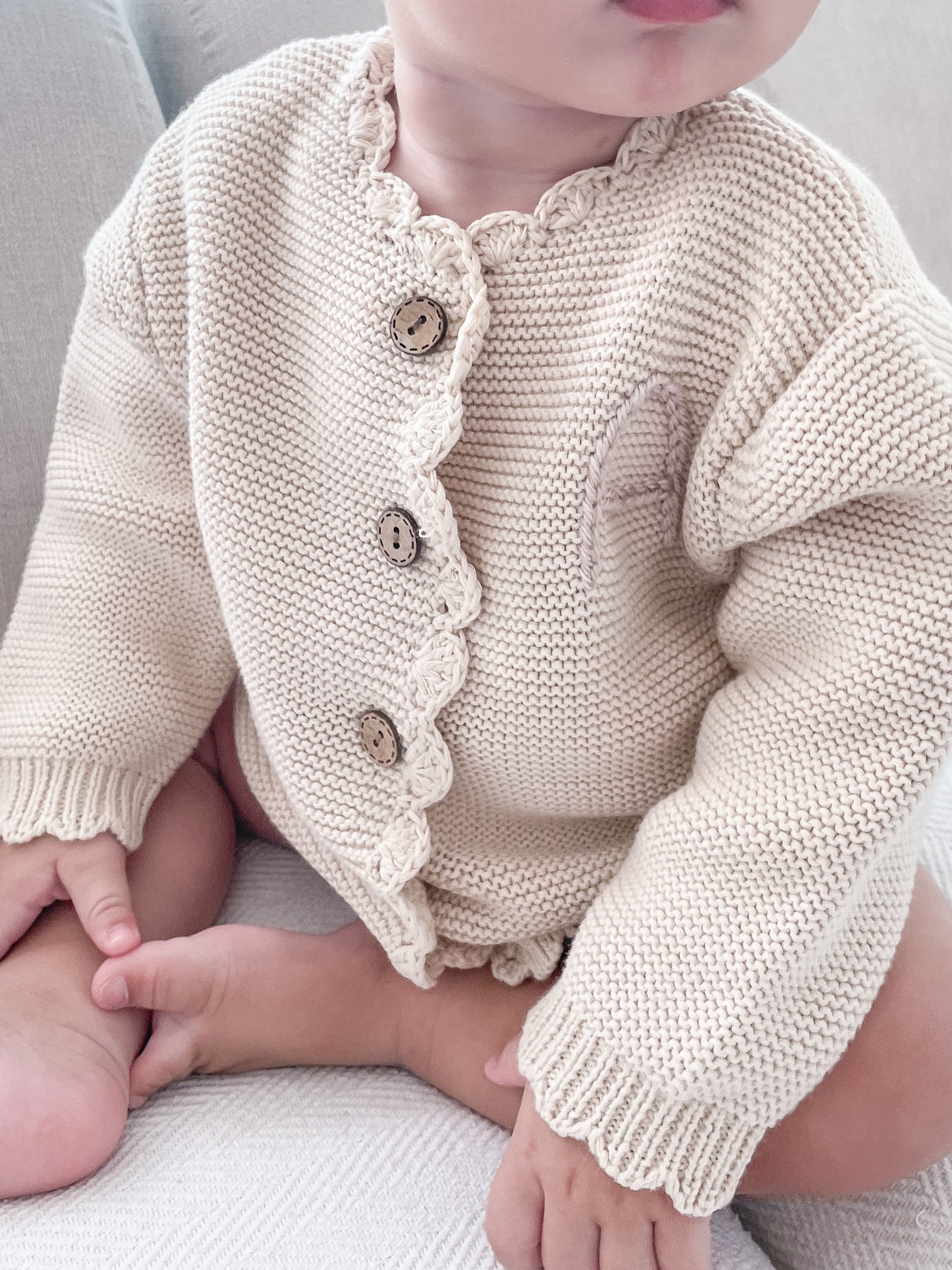 Shop this gorgeous cotton knitted cardigan with a scalloped edge for your little one or as a gift.