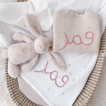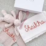 The soft and cuddly bunny plushie is perfect for snuggling, whilst the personalised blanket adds an extra special touch. This gift set is perfect for celebrating a new arrival or as a thoughtful baby shower present.