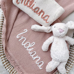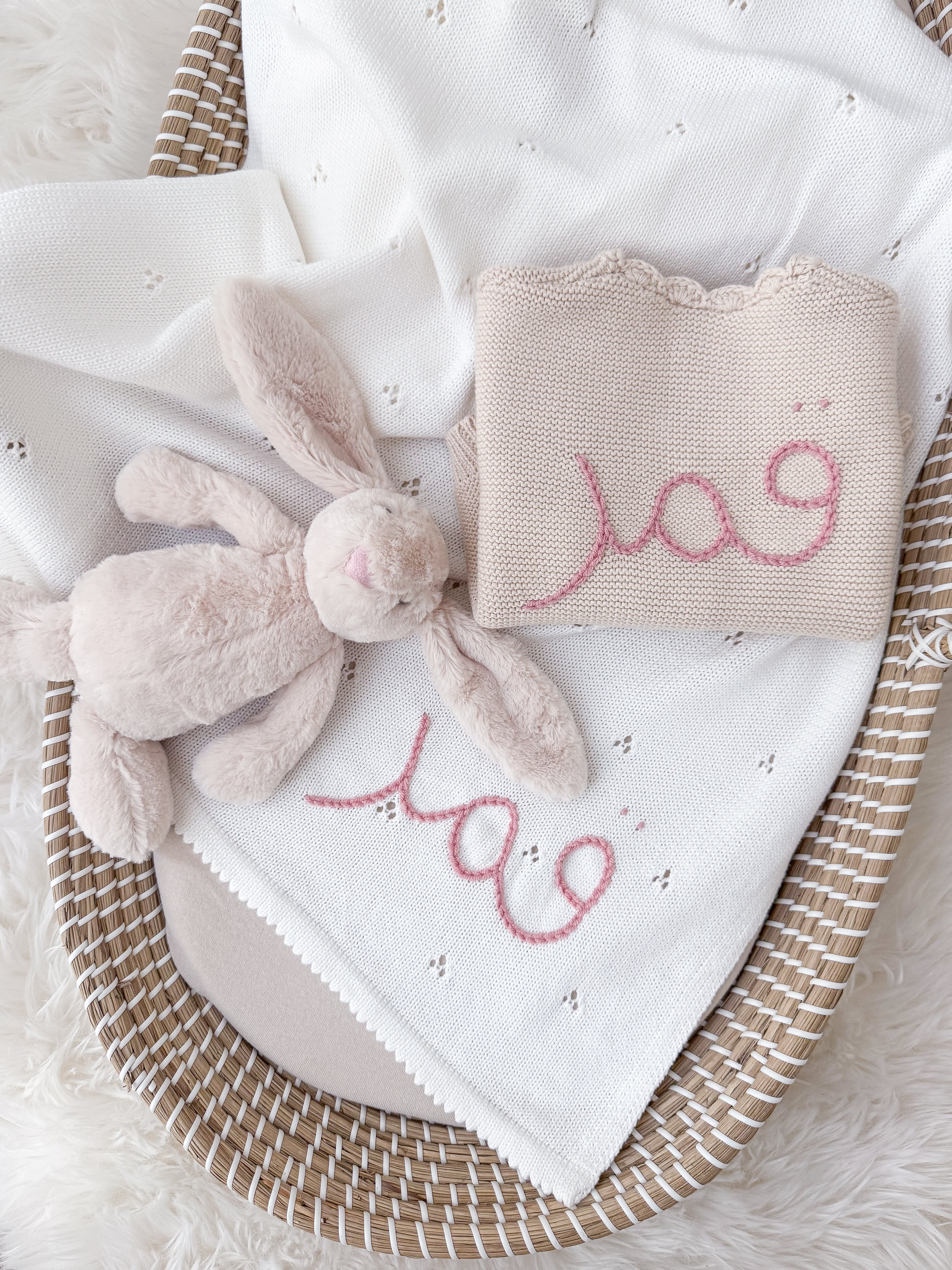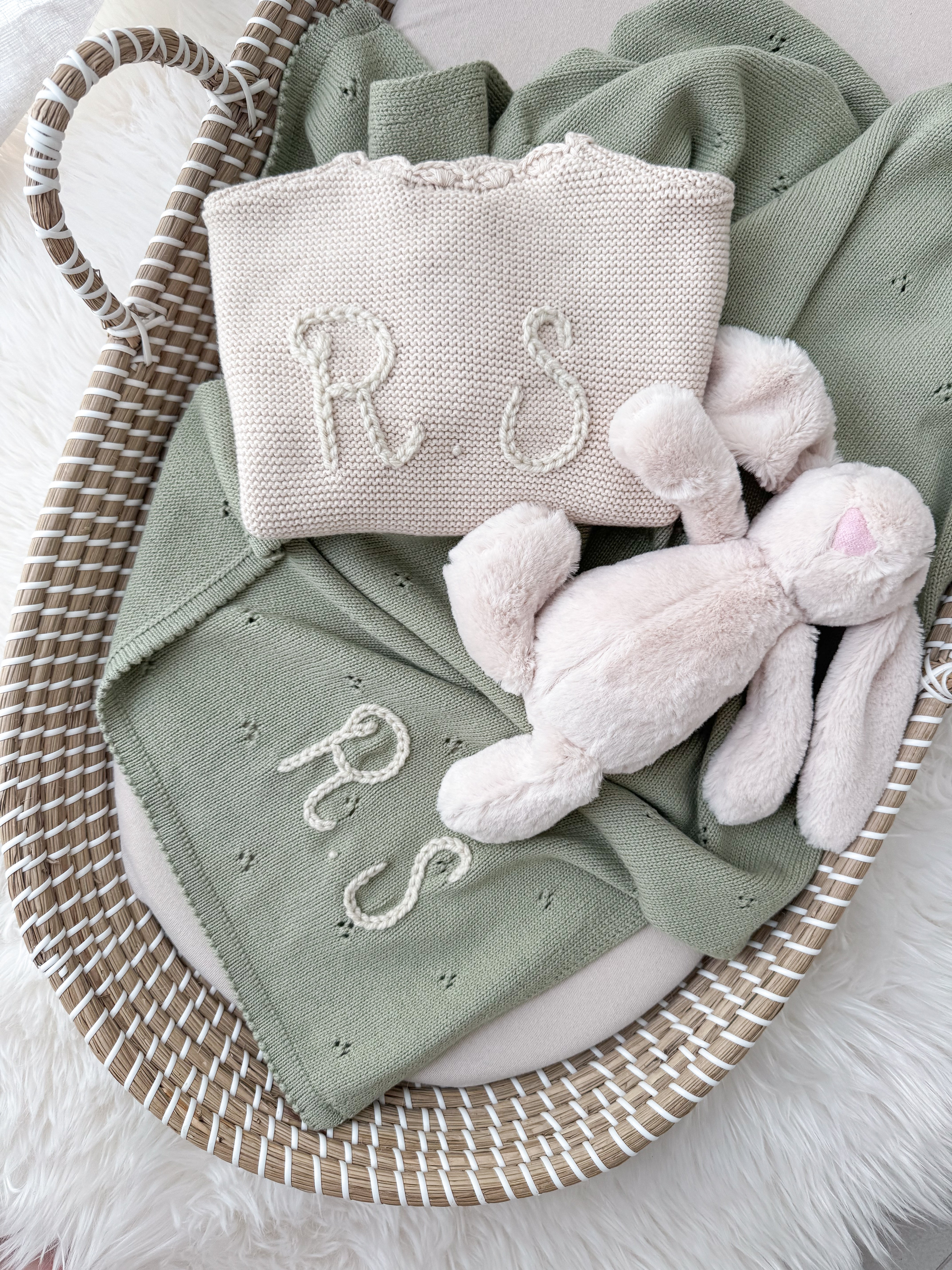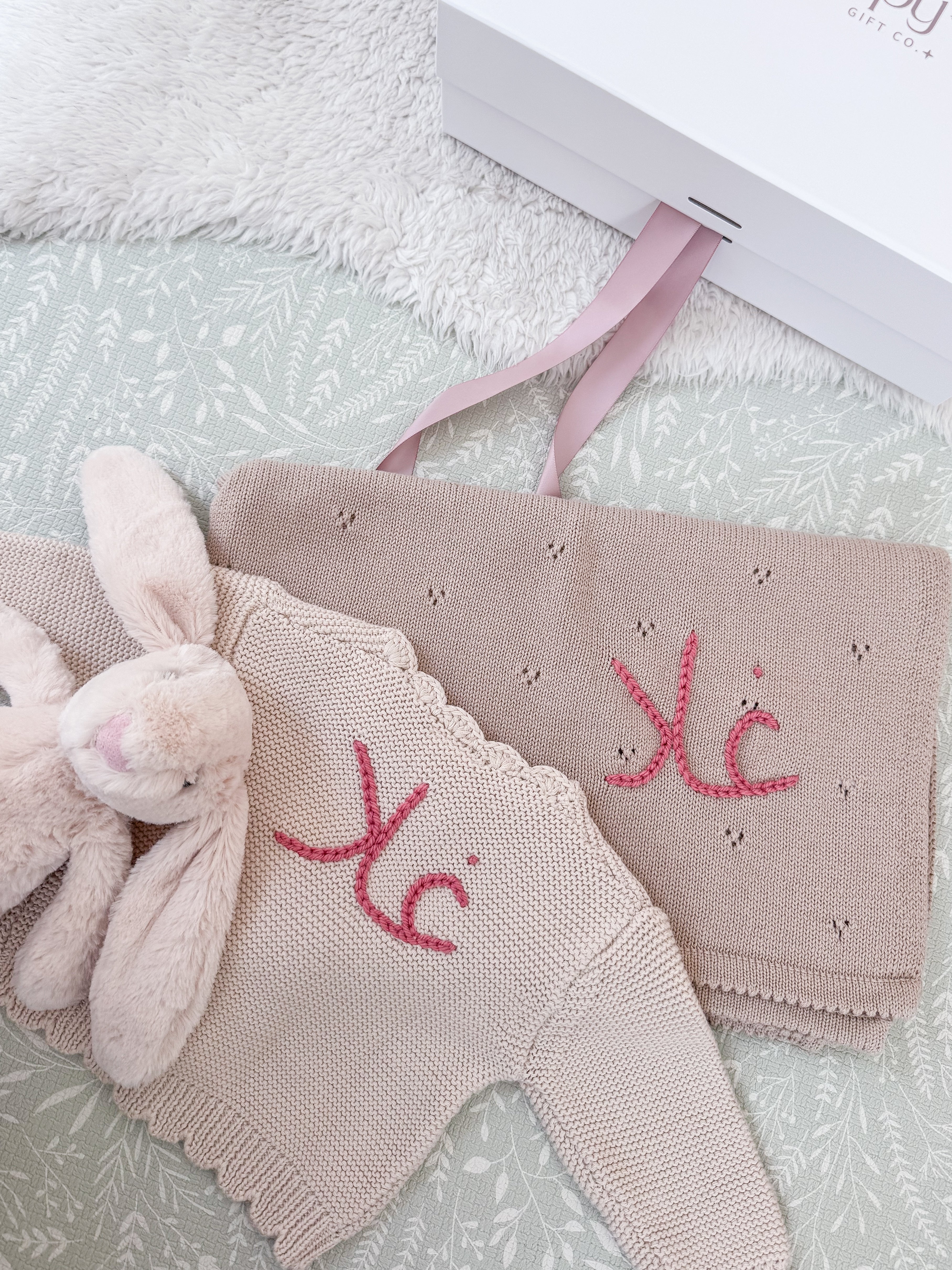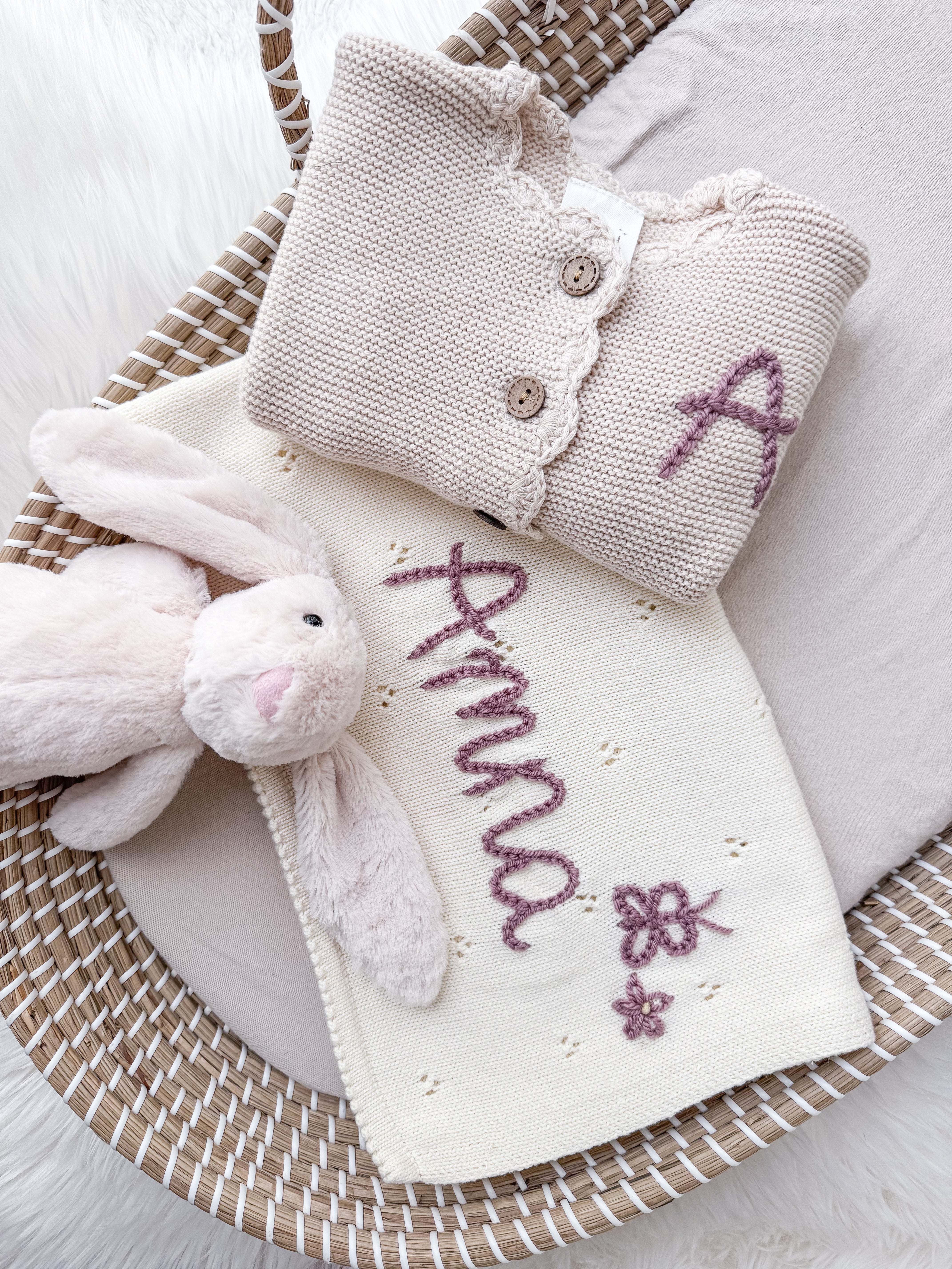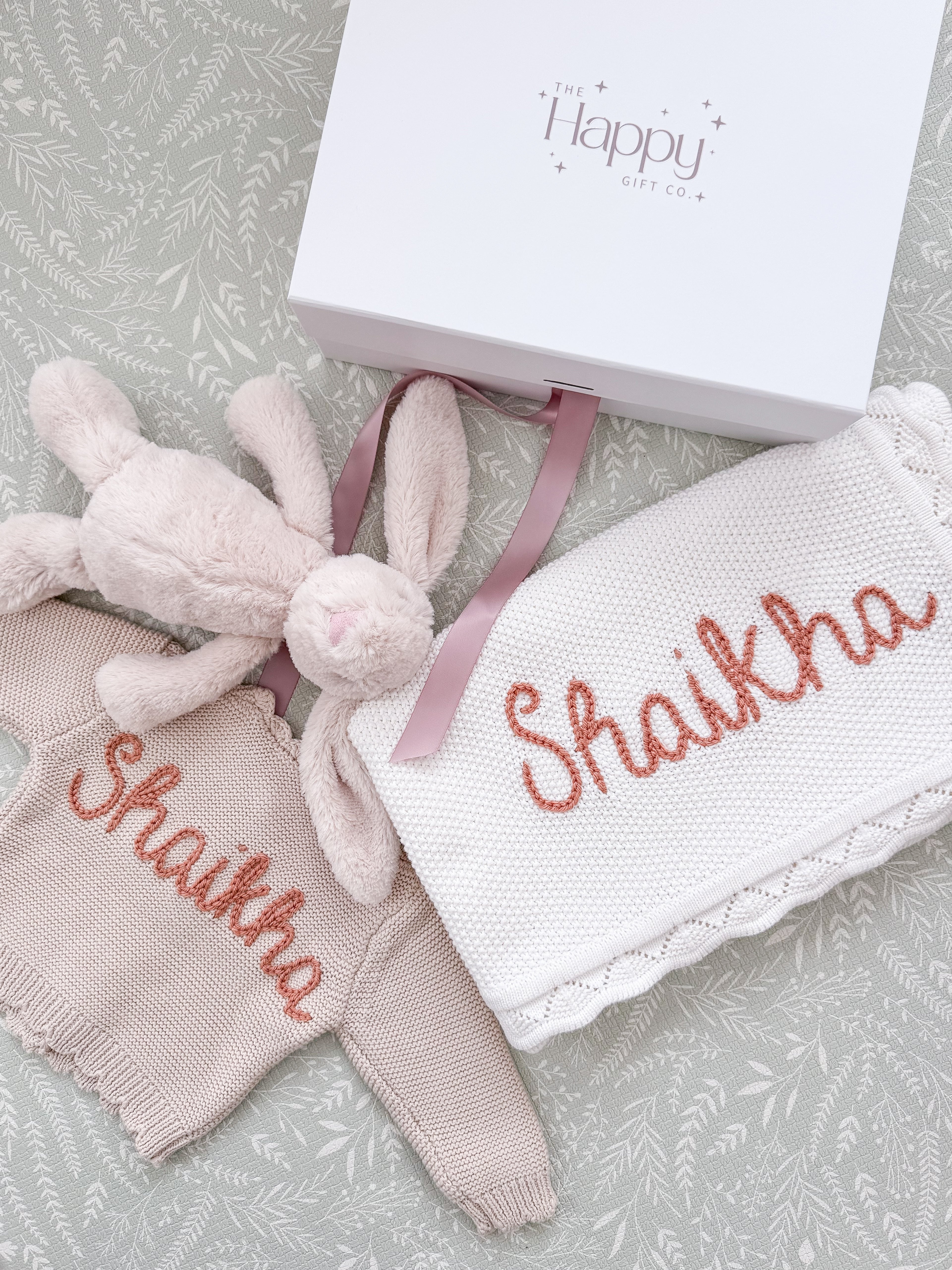 Featuring our super-soft bunny, a cosy blanket and cardigan embroidered with baby's name.