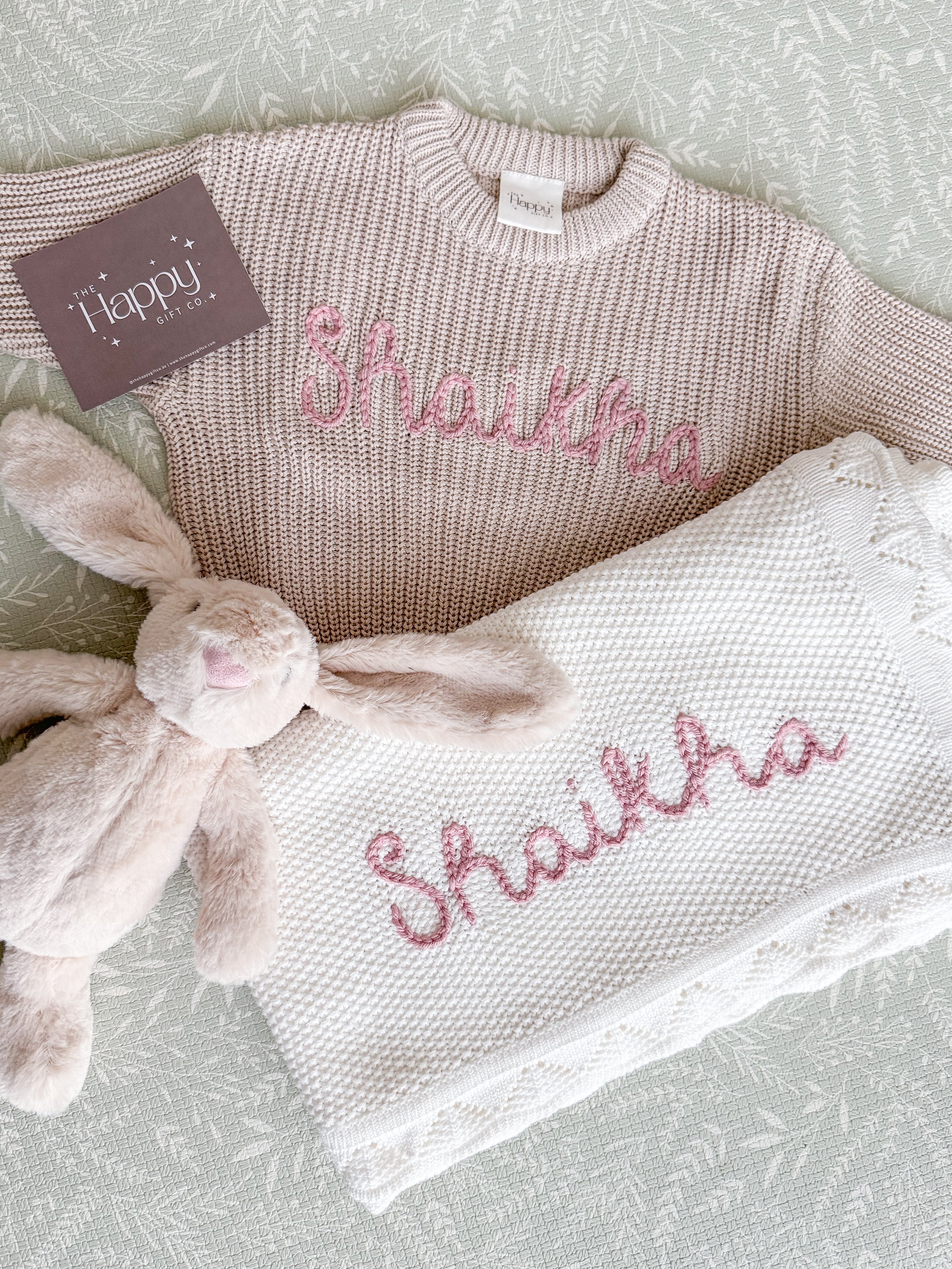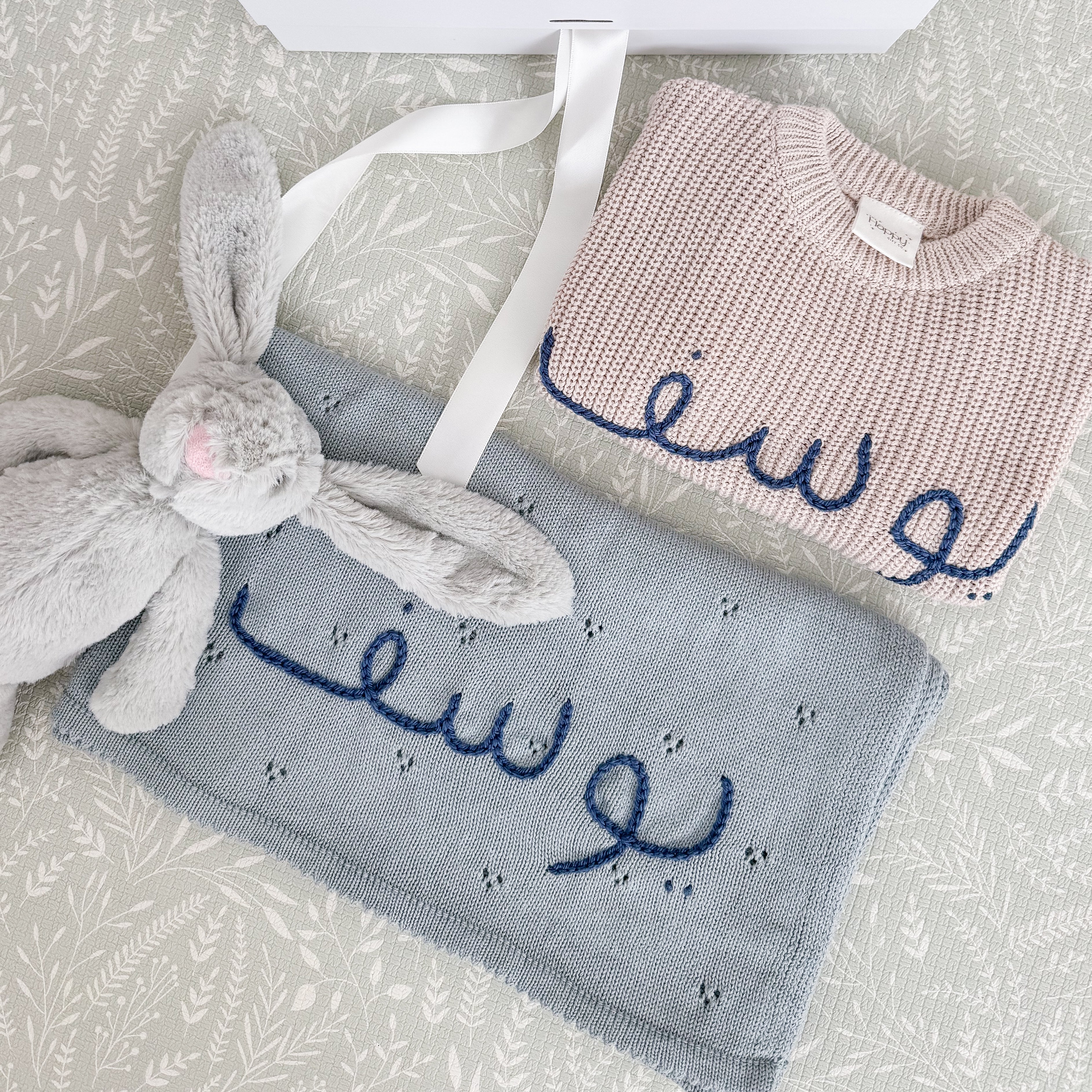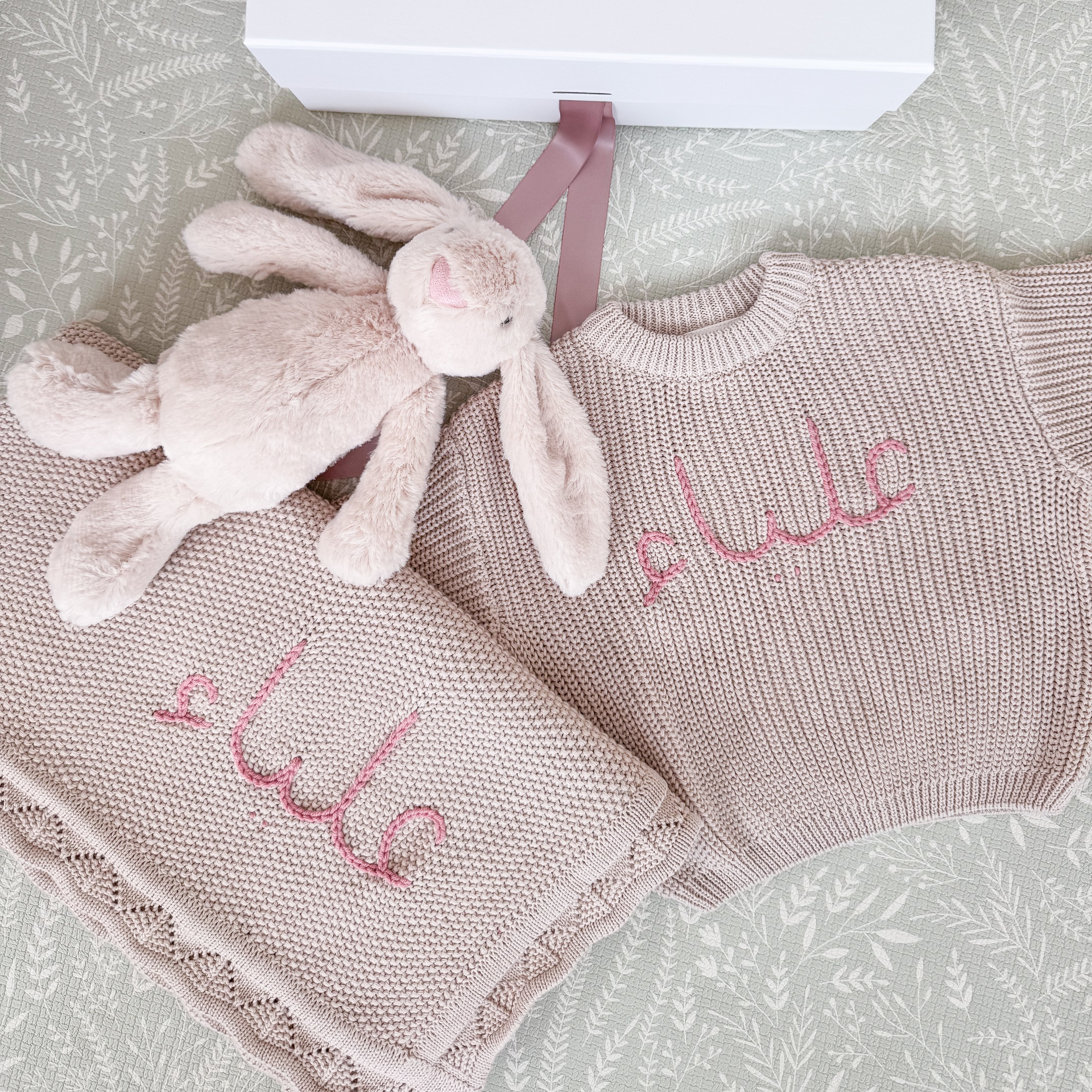 Featuring our super-soft bunny, a cosy blanket and sweater embroidered with baby's name.