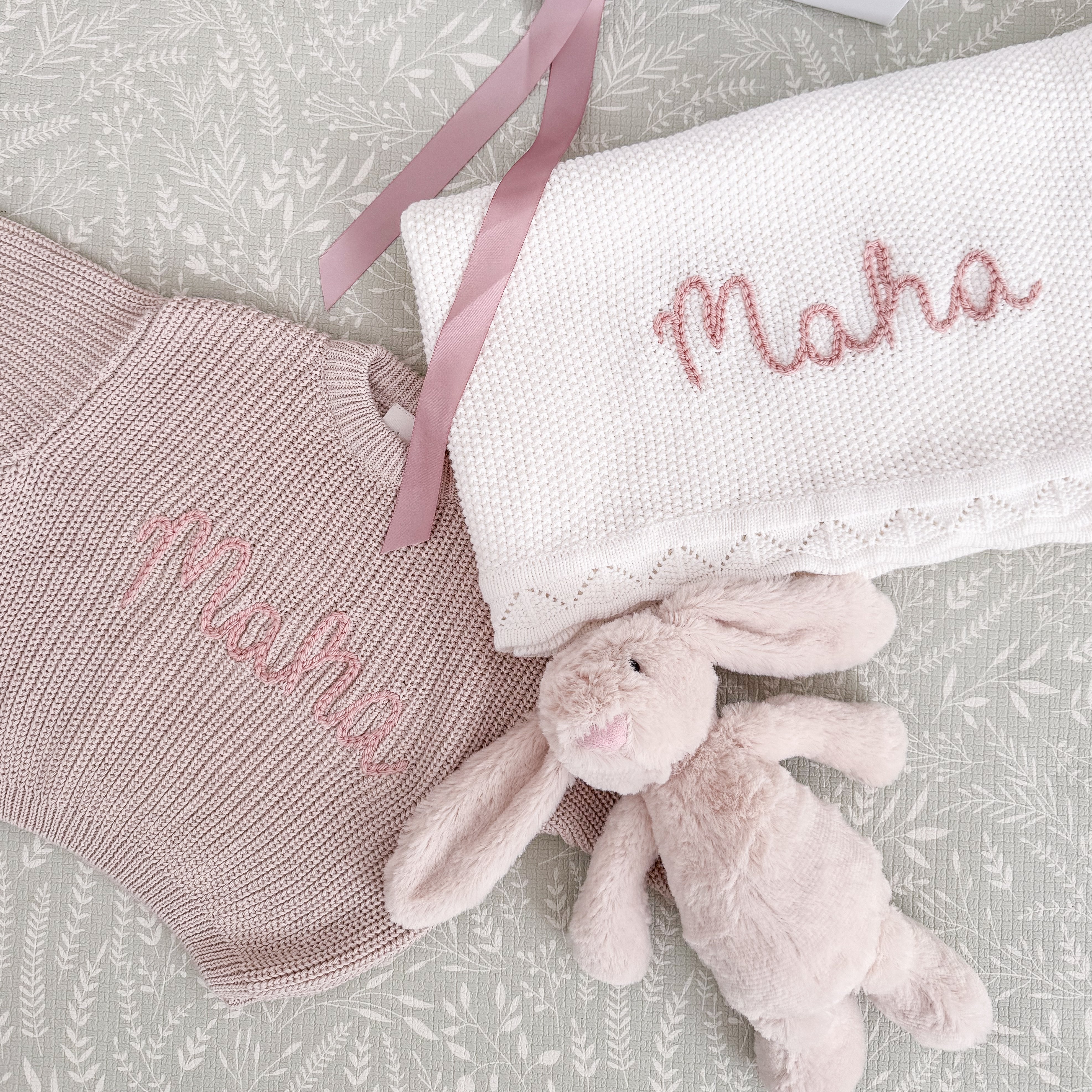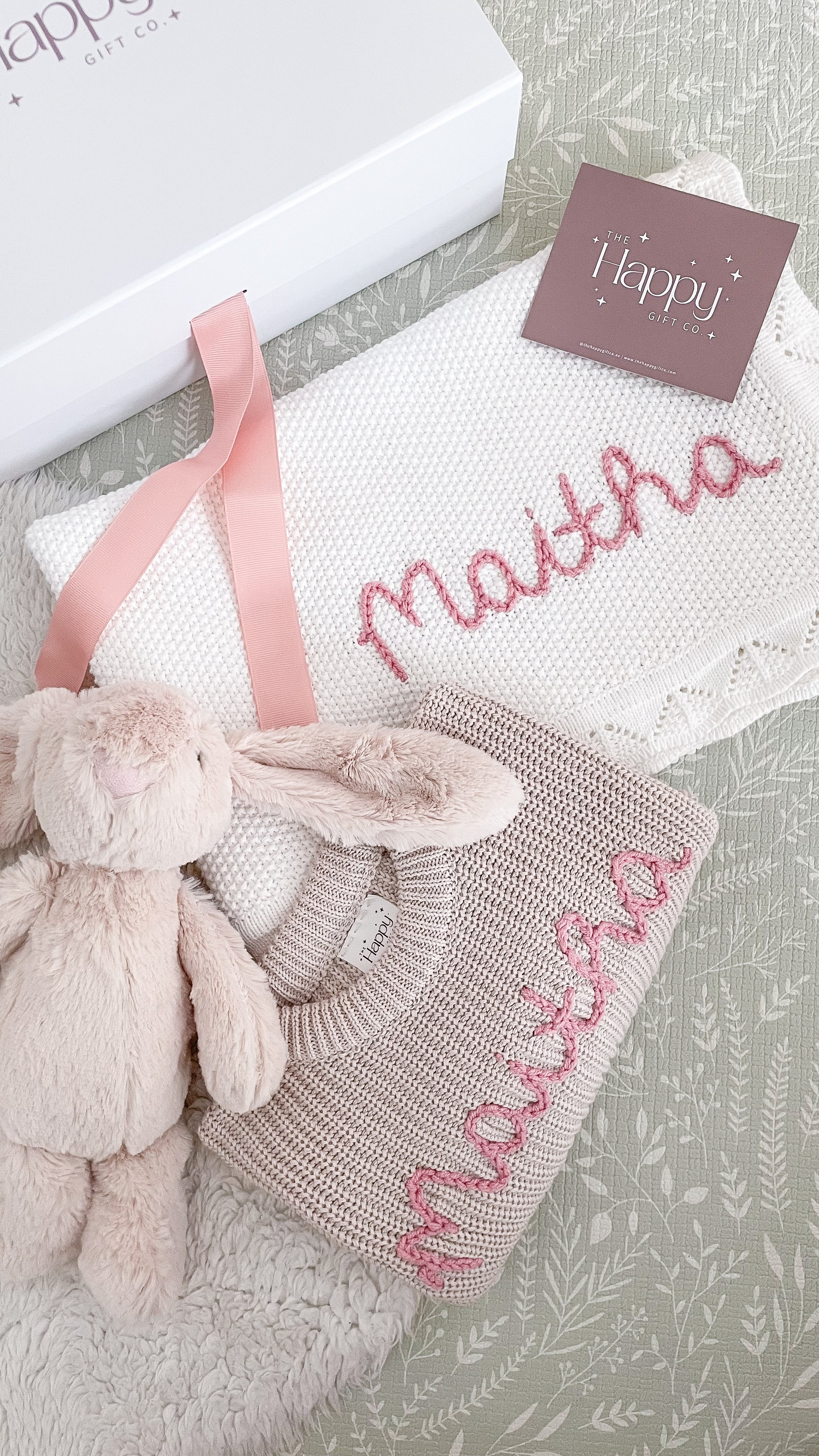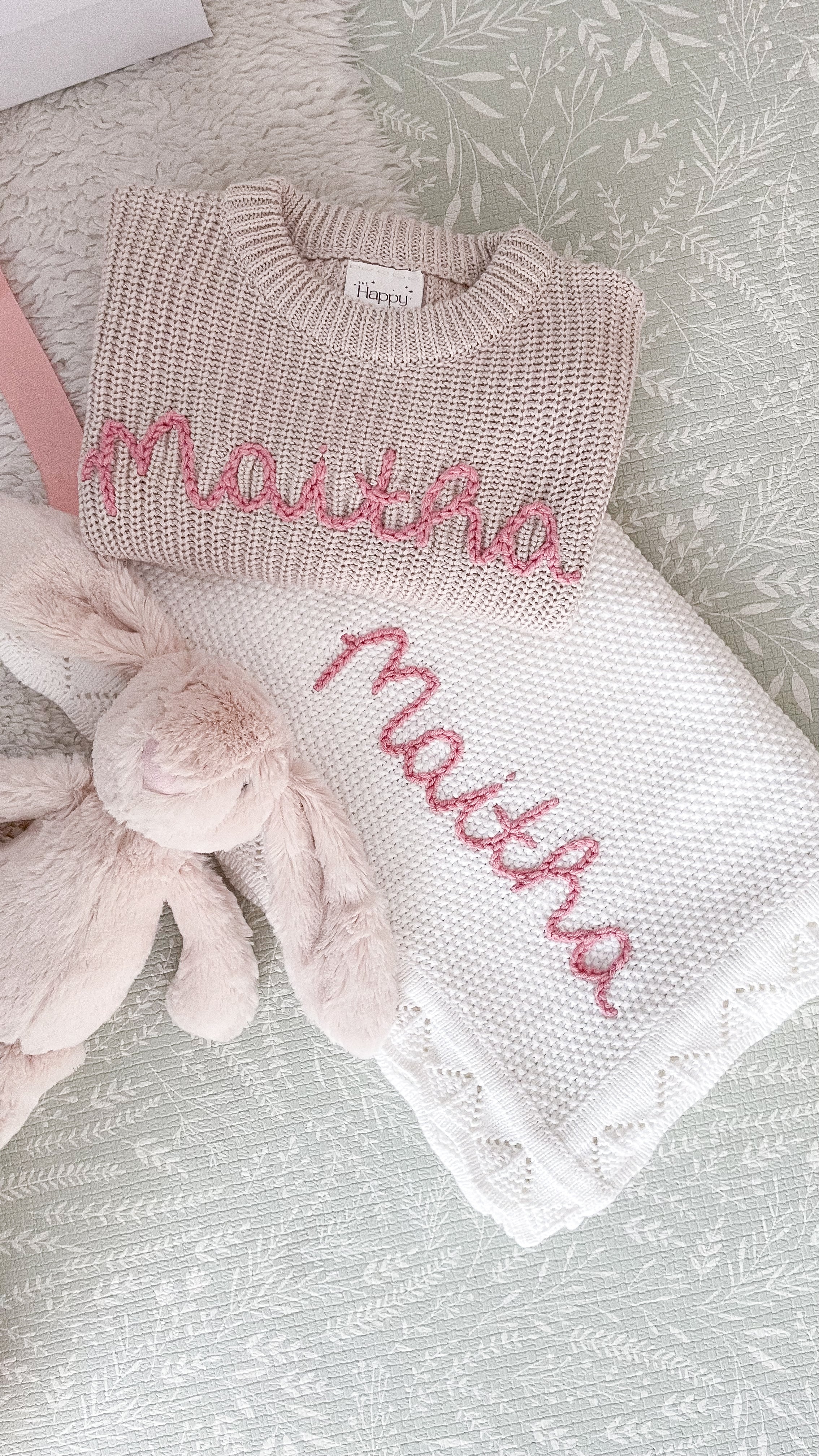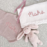 Featuring our super-soft bunny, a cosy blanket and sweater embroidered with baby's name.
