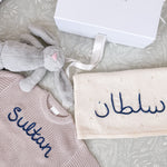 The soft and cuddly bunny plushie is perfect for snuggling, whilst the personalised blanket adds an extra special touch. This gift set is perfect for celebrating a new arrival or as a thoughtful baby shower present.