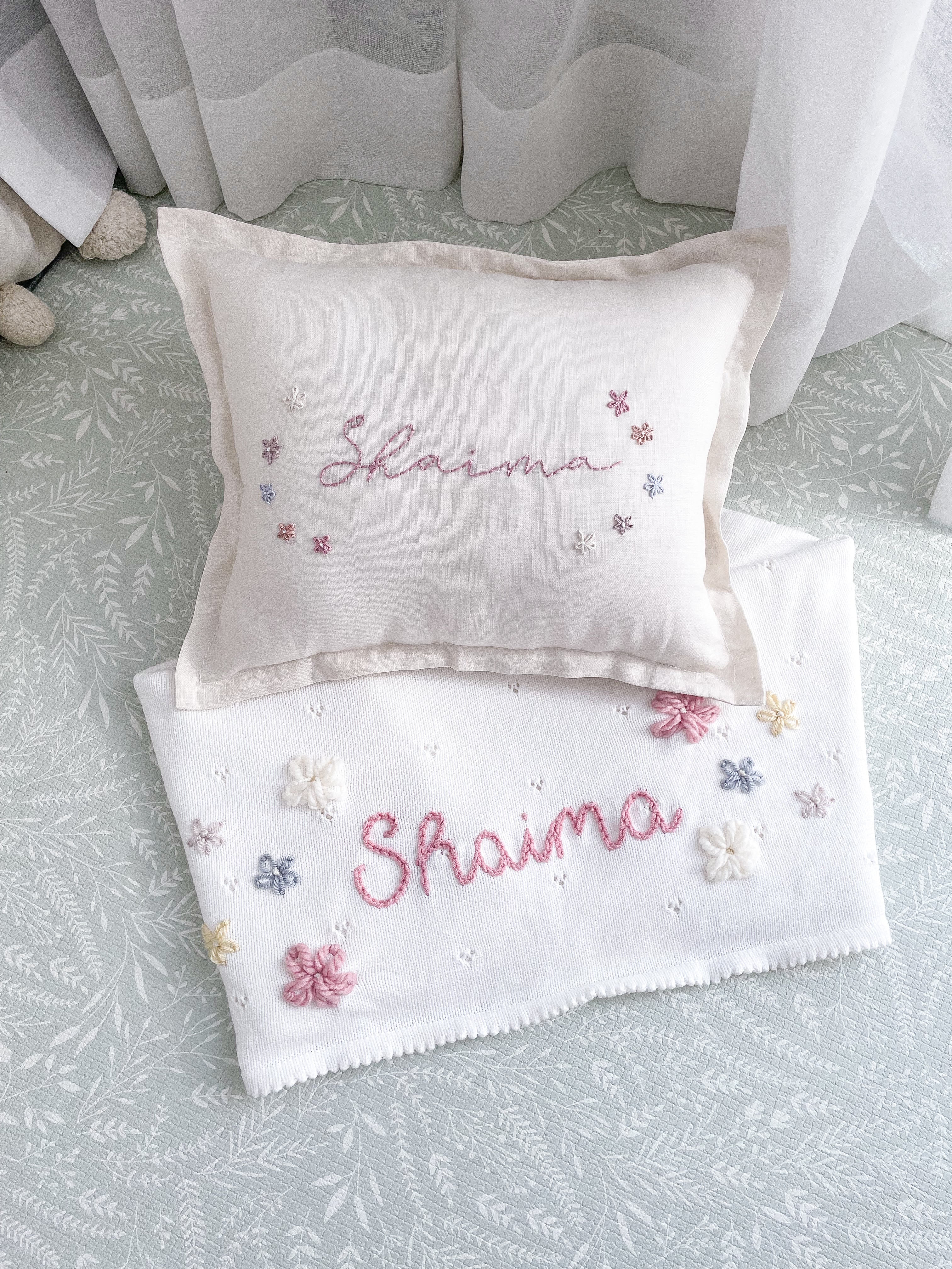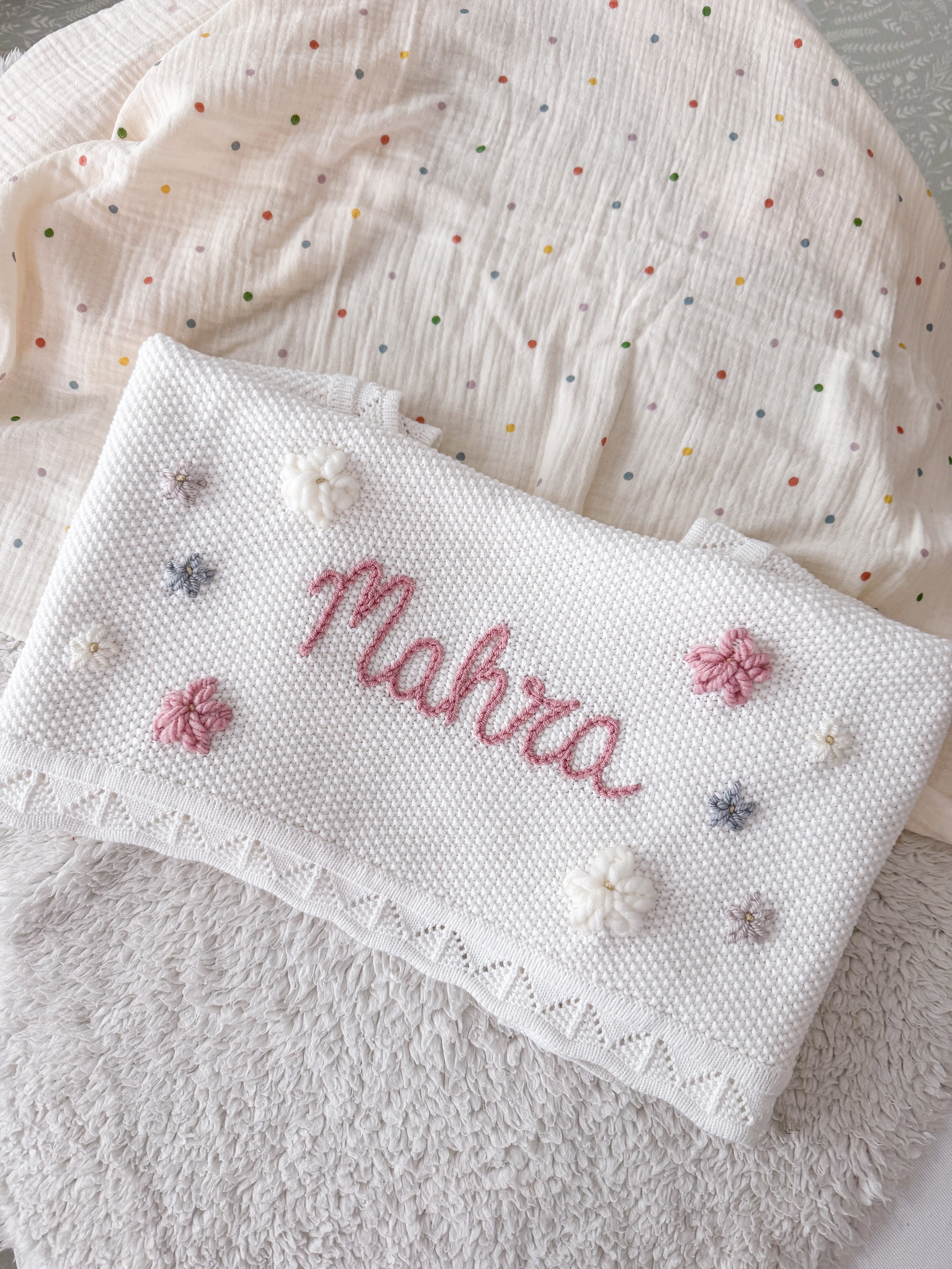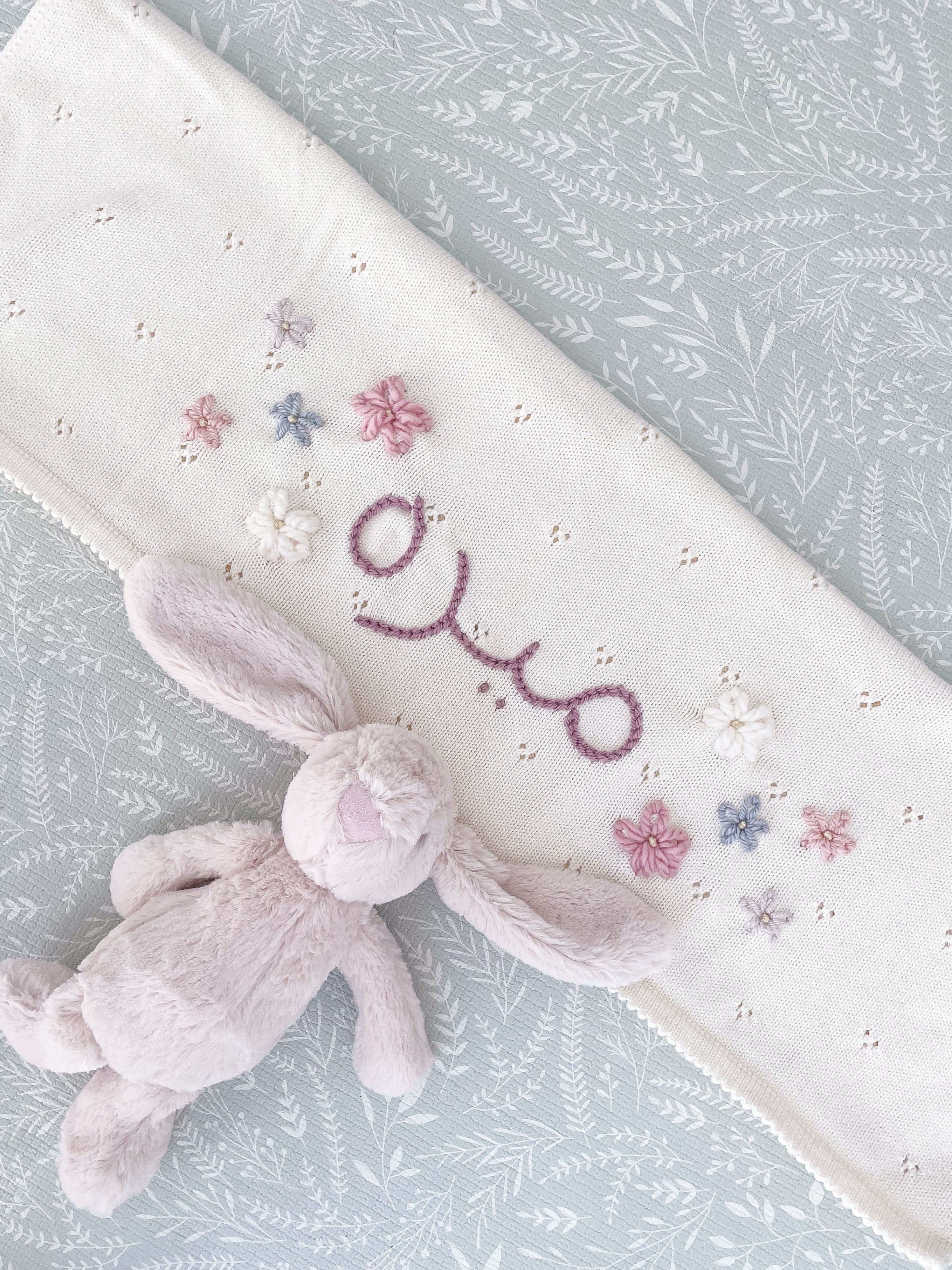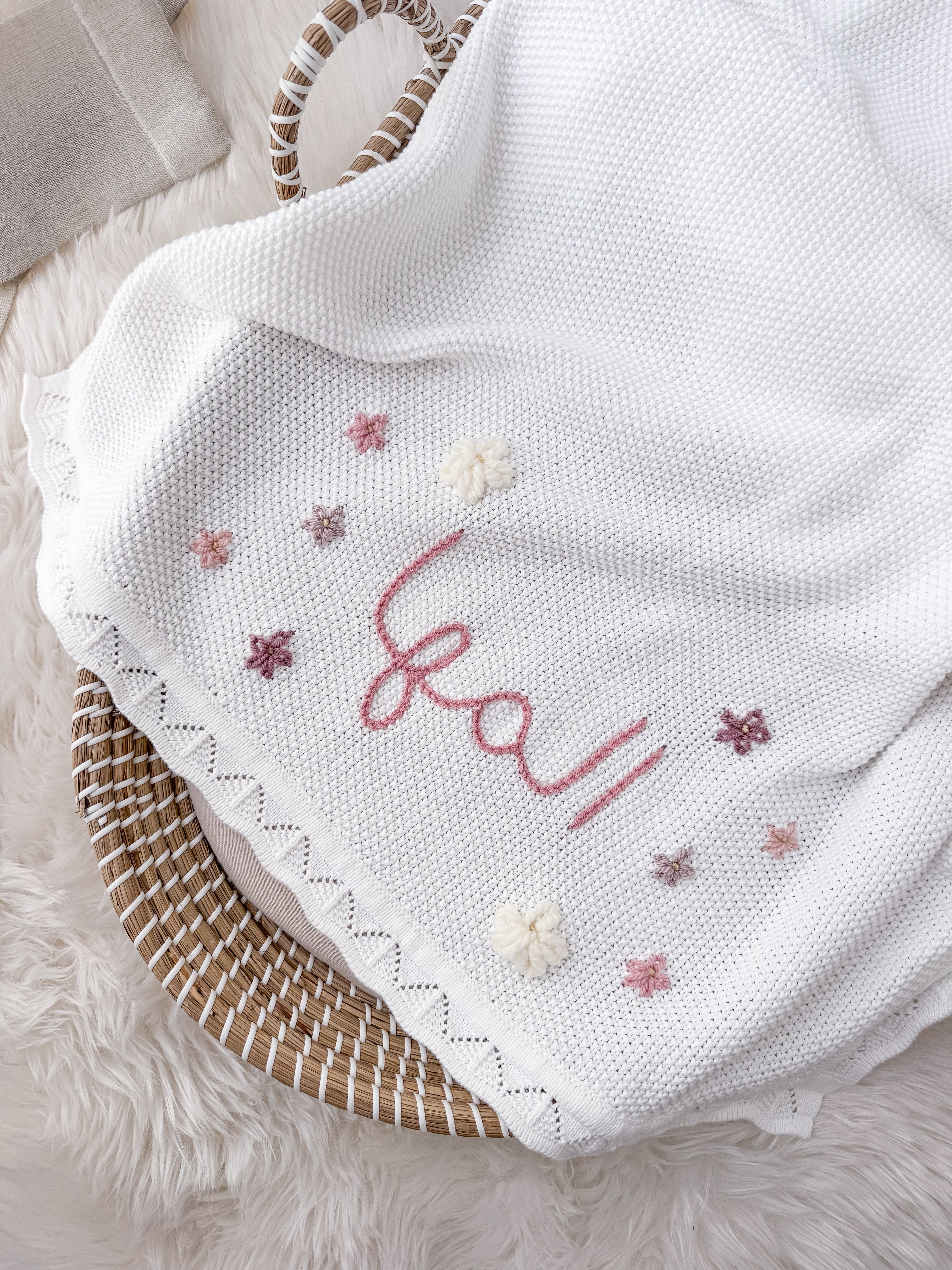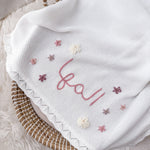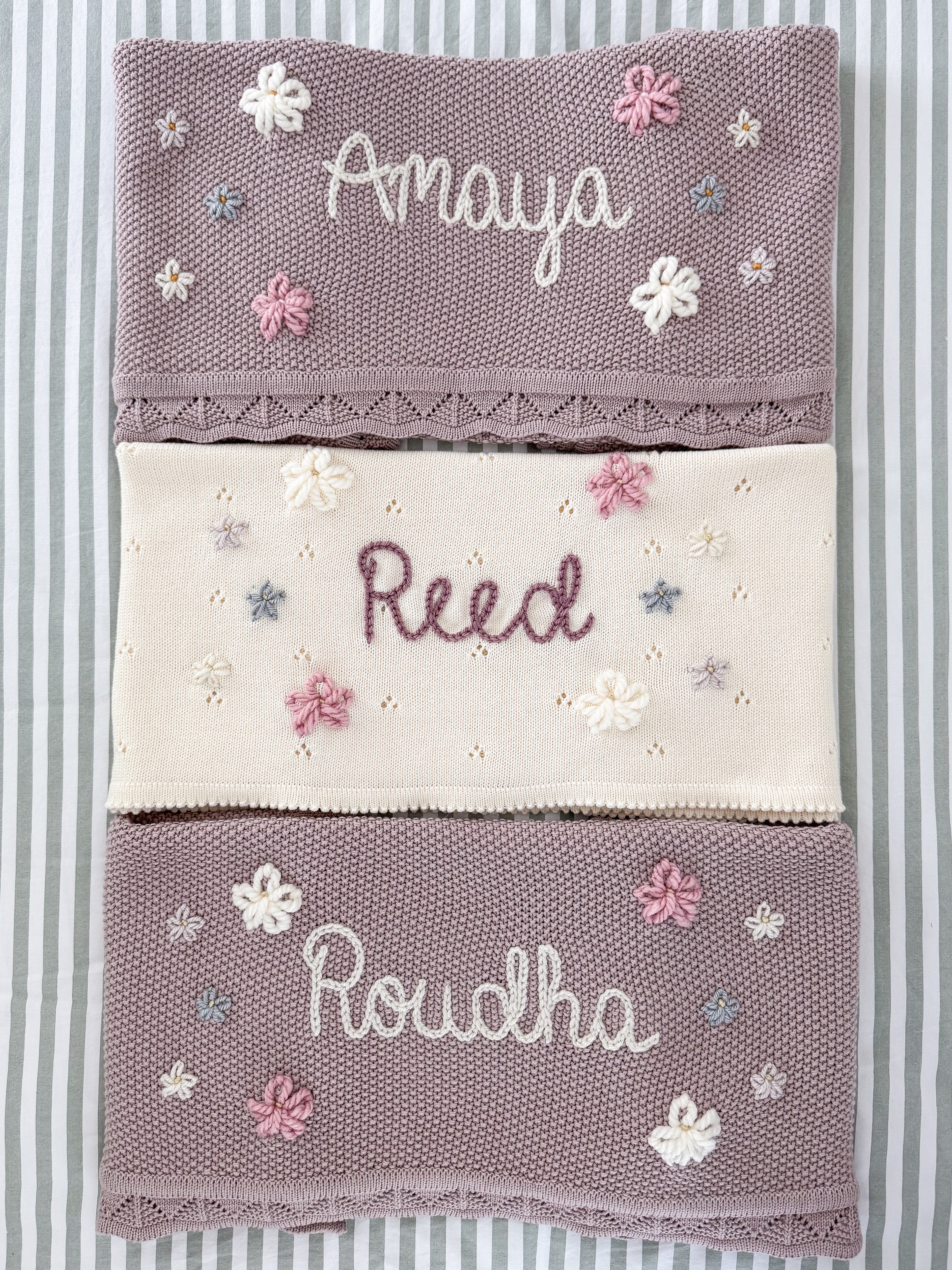 Names are hand-embroidered and are sewn along the bottom centre of the blanket, if you would like the name to be placed in another position on the blanket, please let us know in order notes box below.