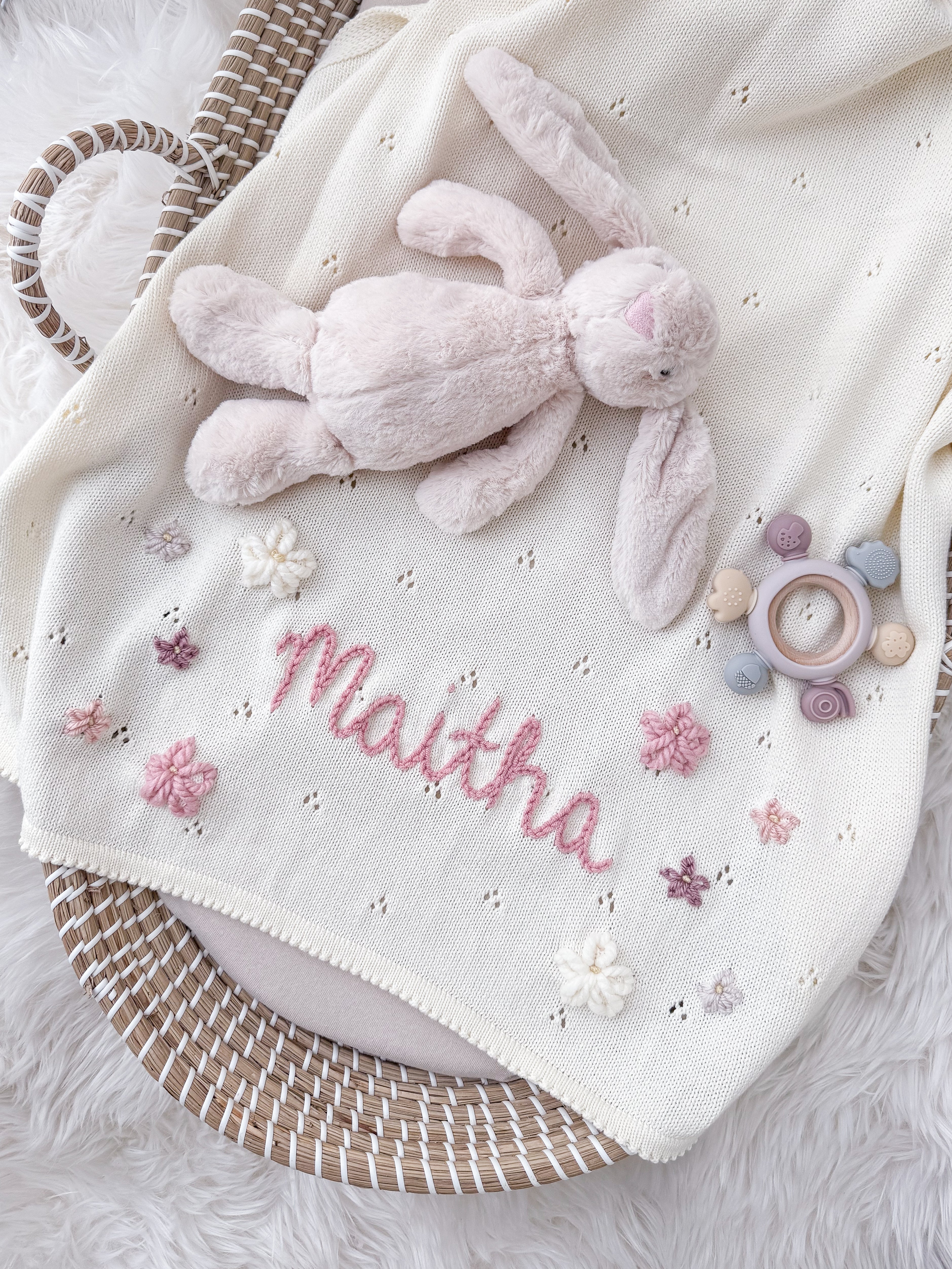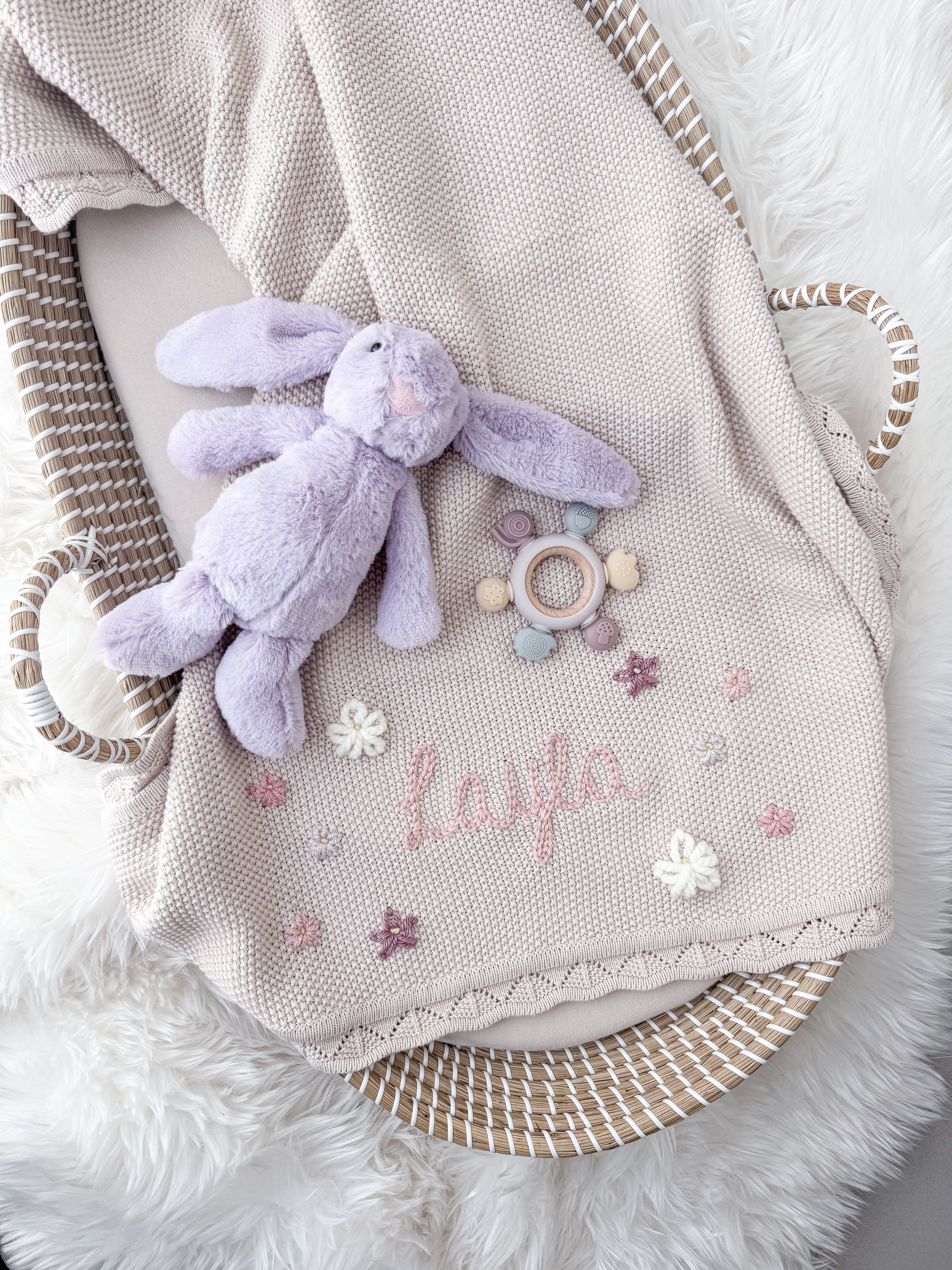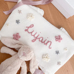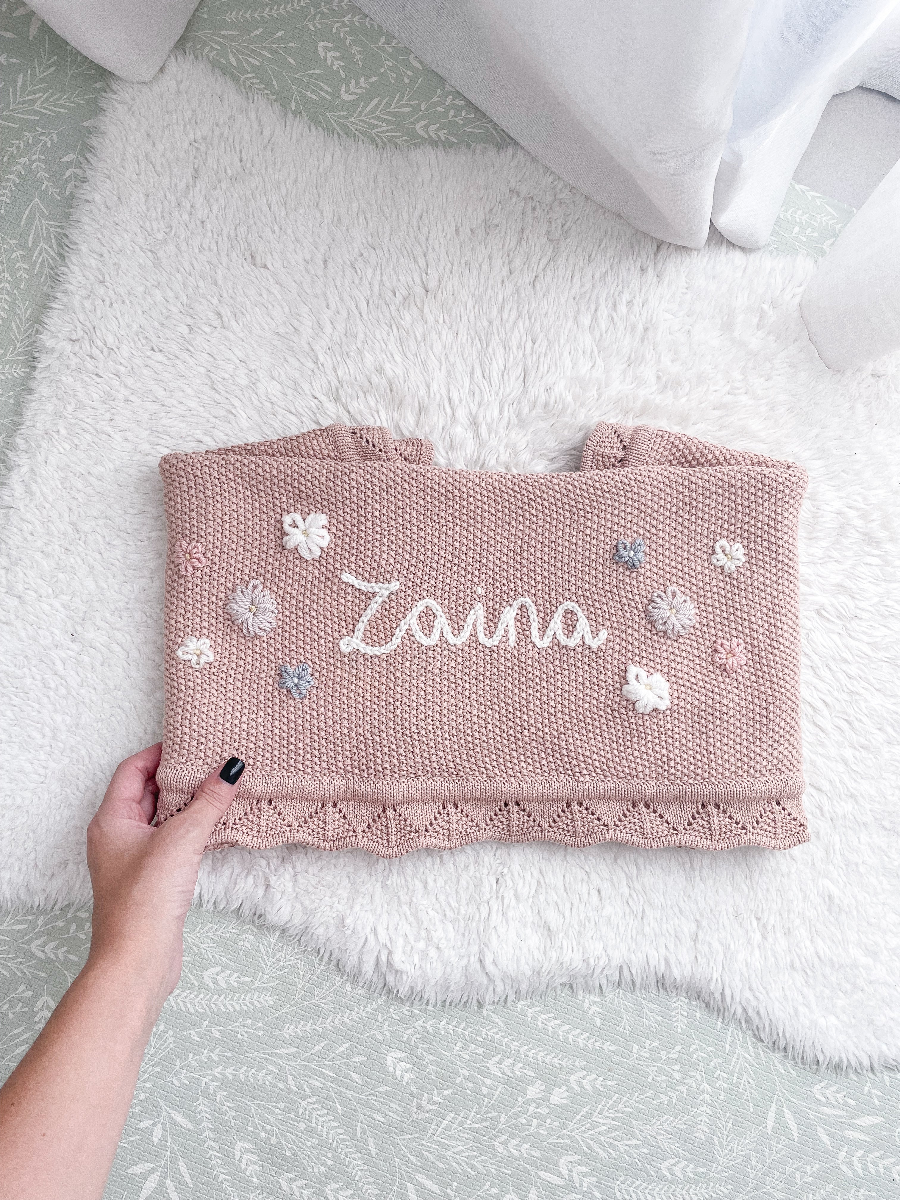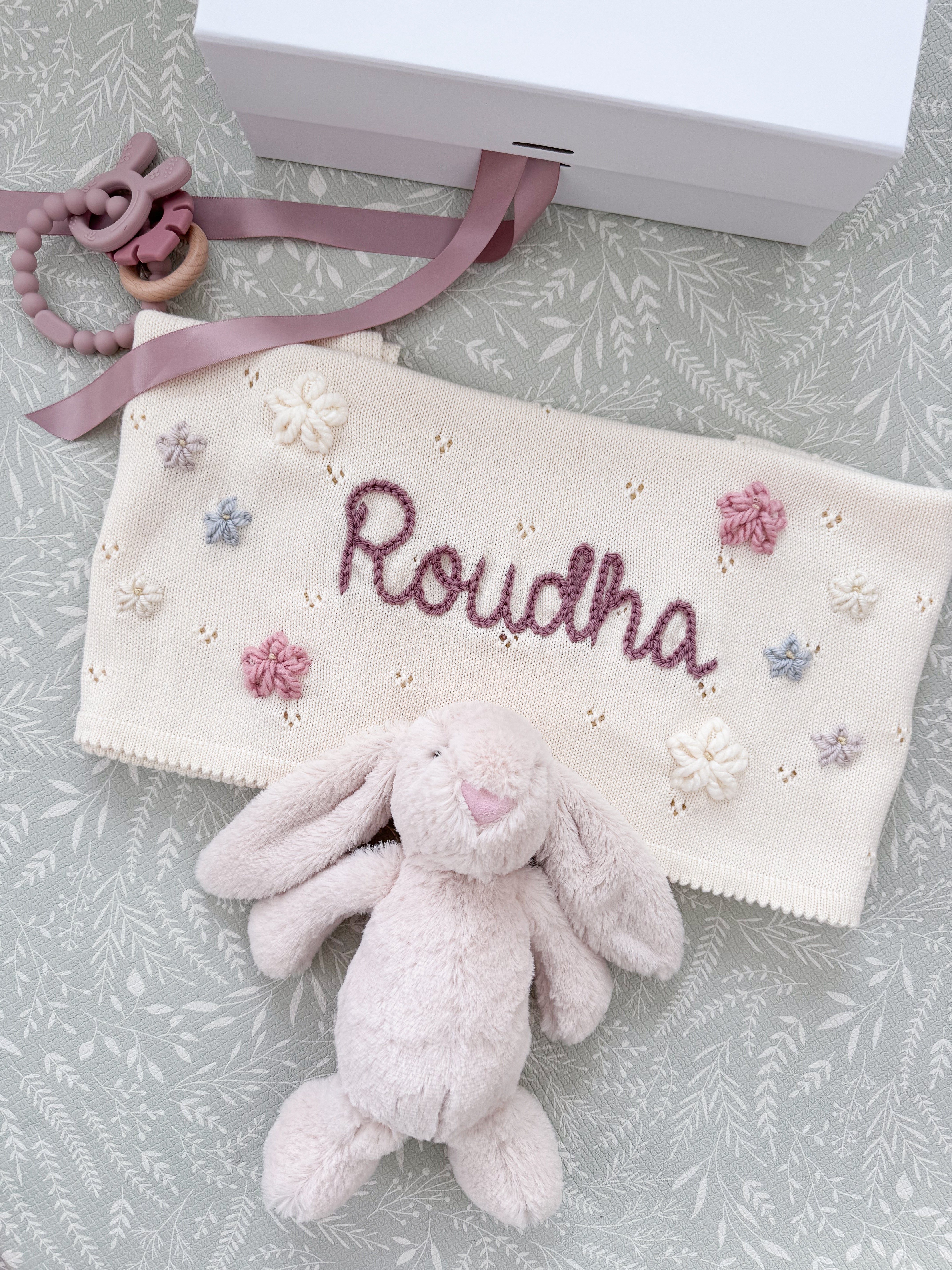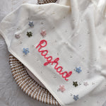Names are hand-embroidered and are sewn along the bottom centre of the blanket, if you would like the name to be placed in another position on the blanket, please let us know in order notes box below.