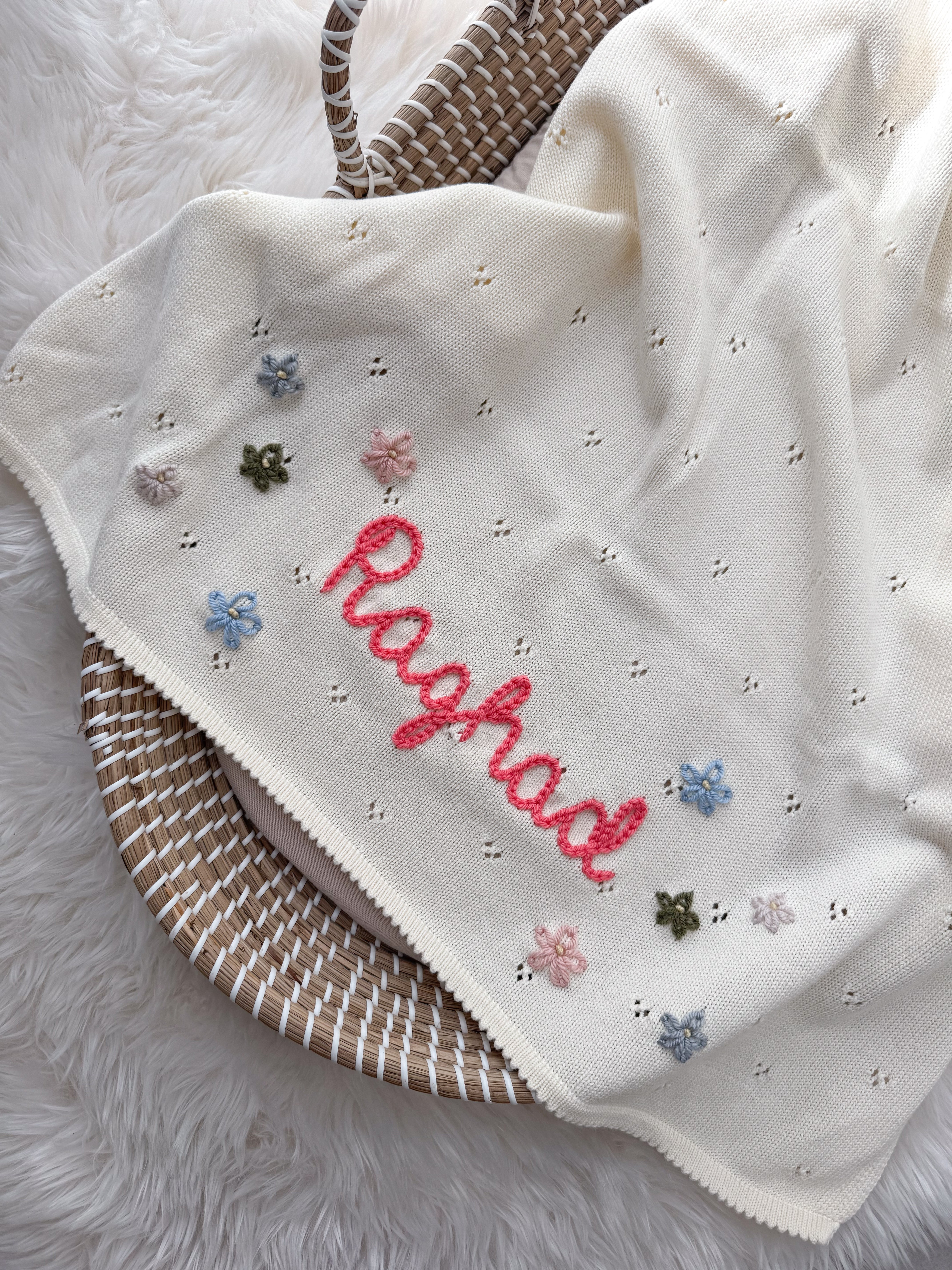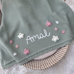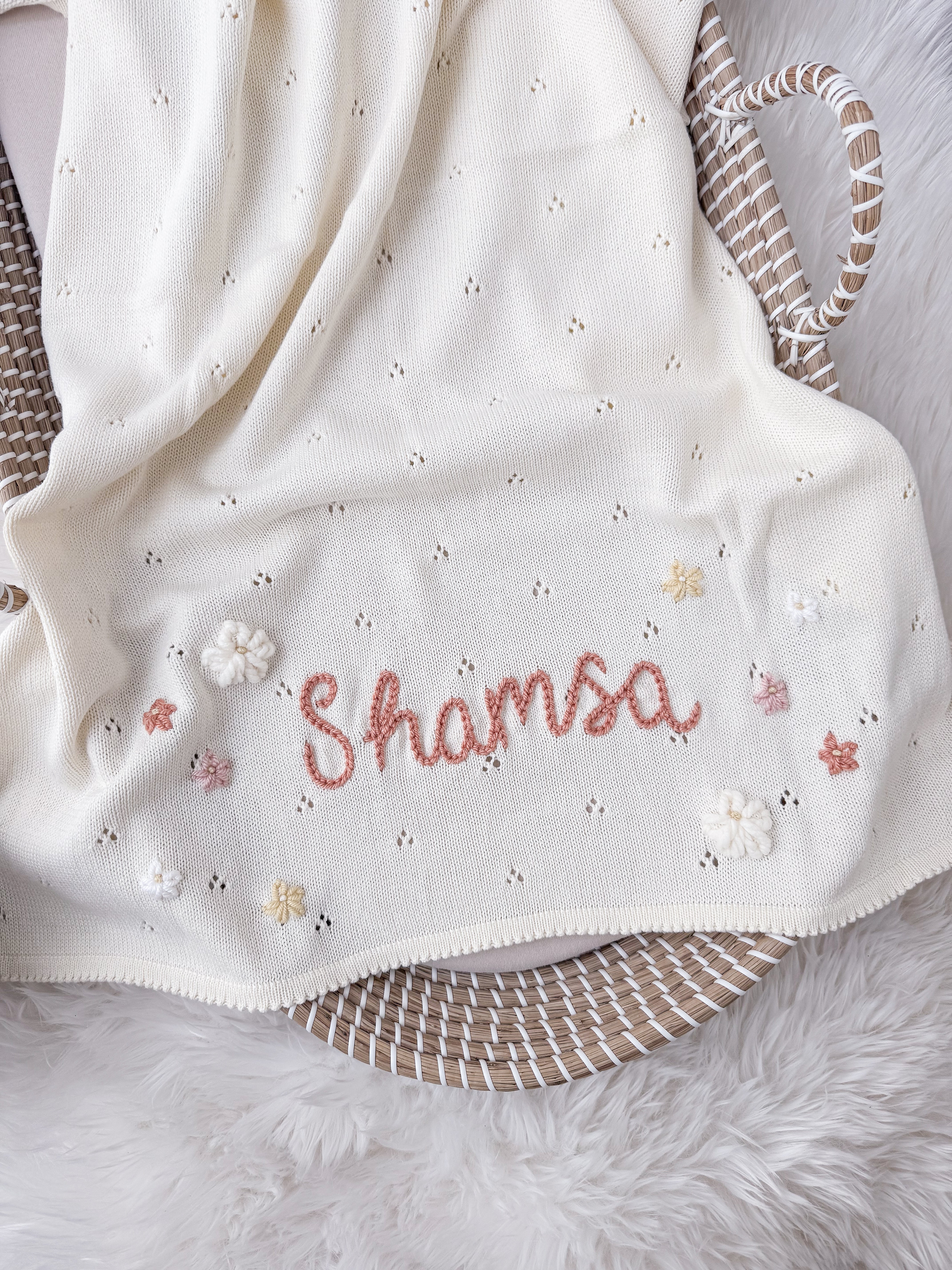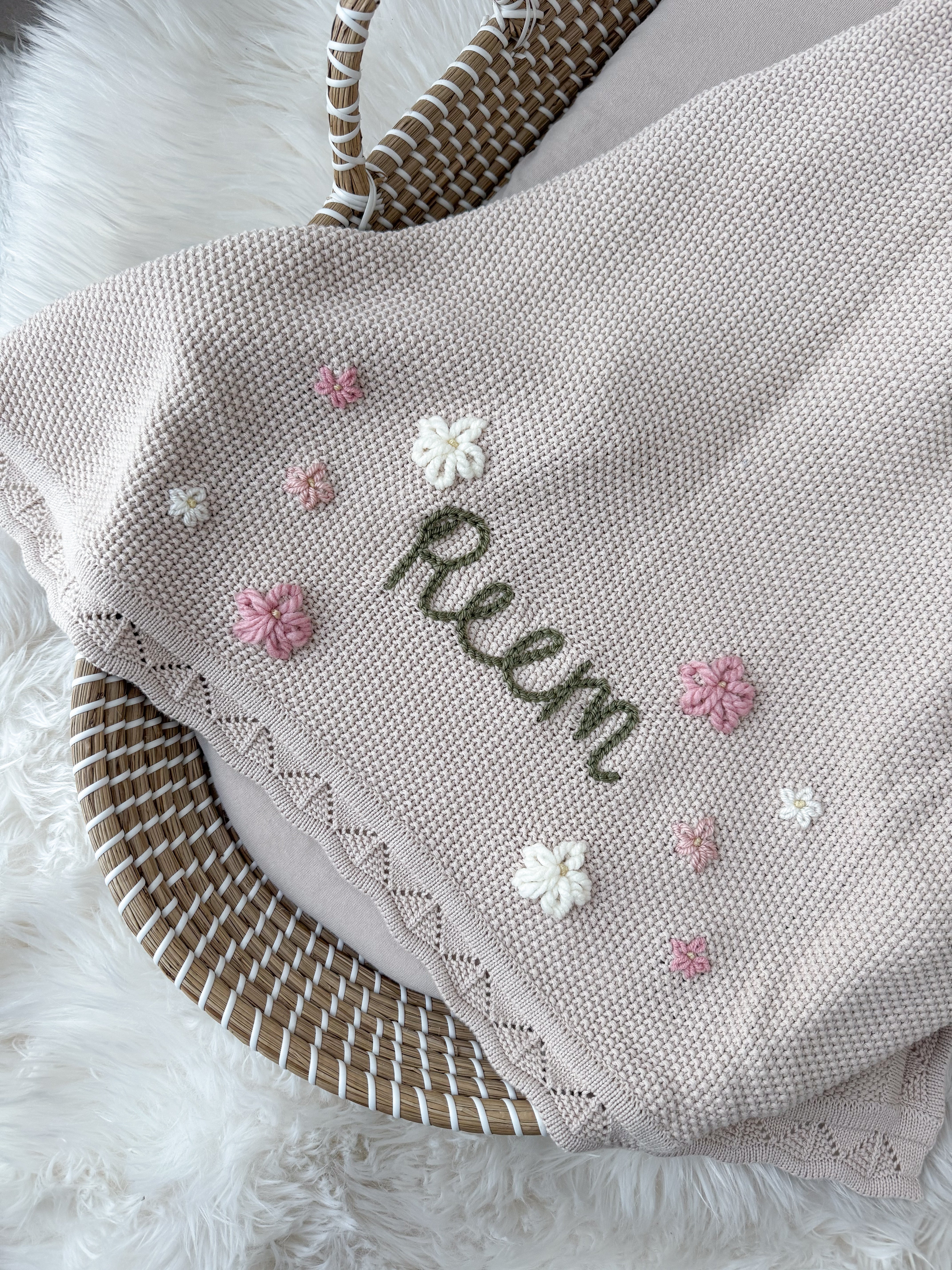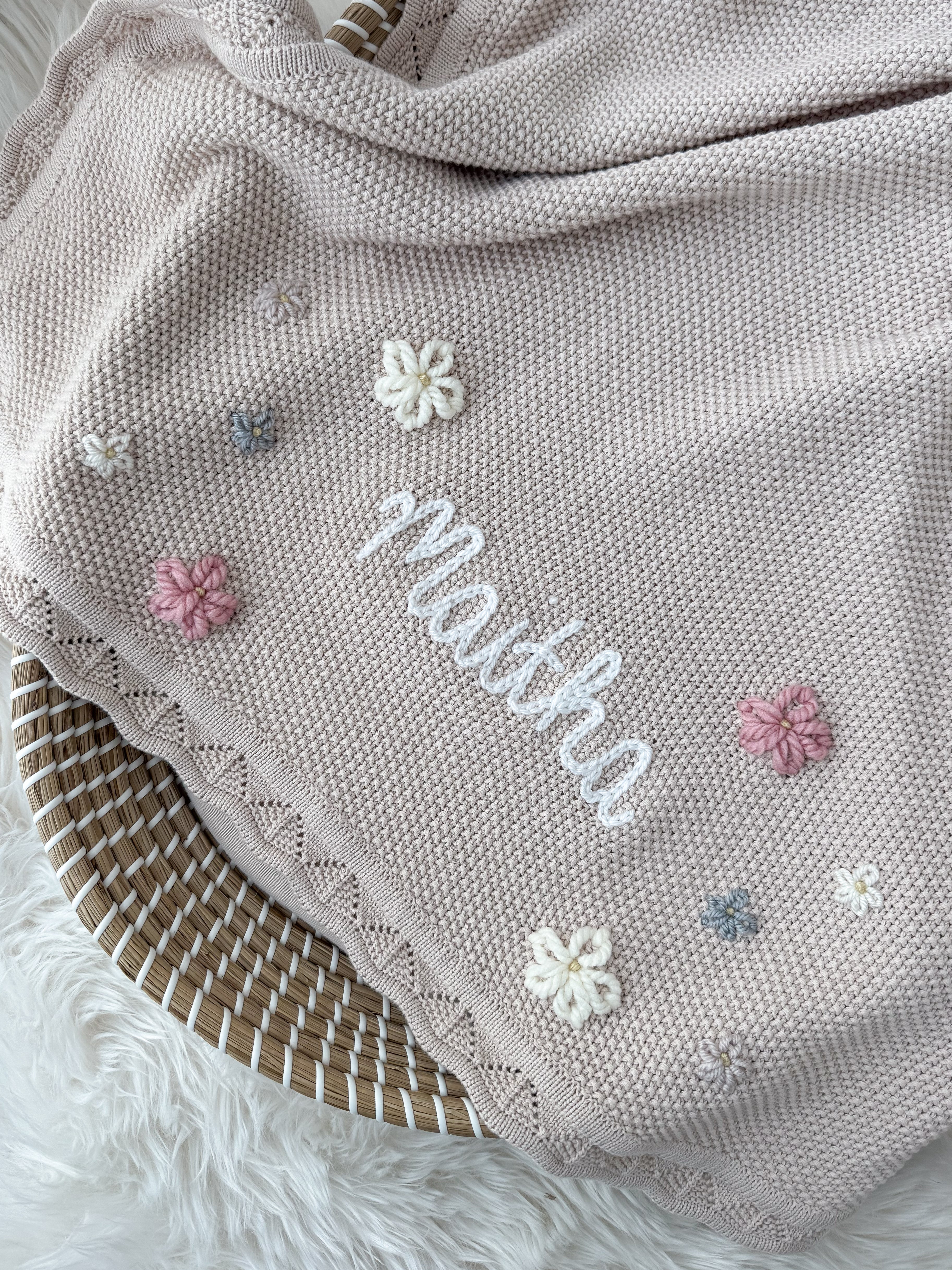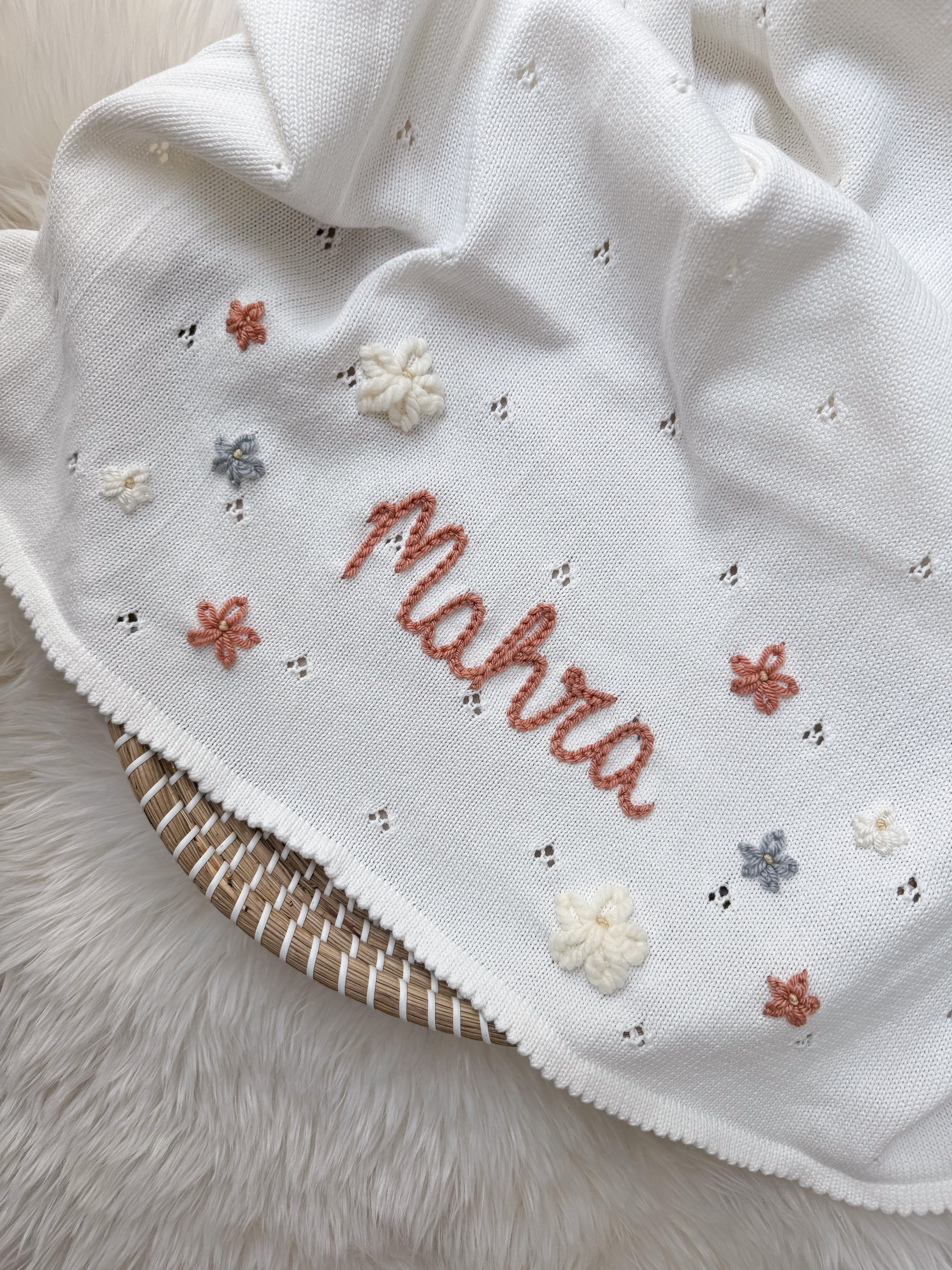 Names are hand-embroidered and are sewn along the bottom centre of the blanket, if you would like the name to be placed in another position on the blanket, please let us know in order notes box below.