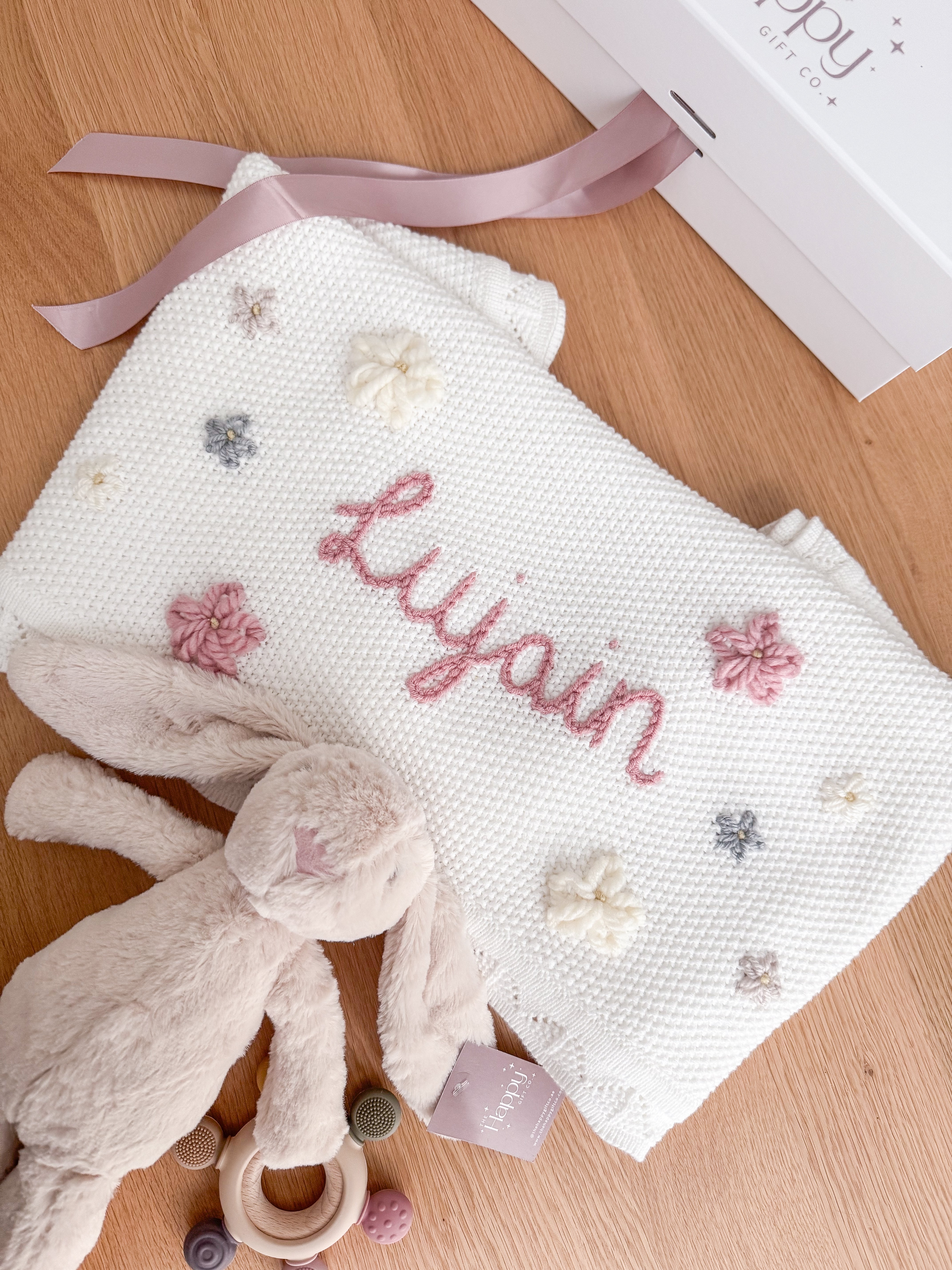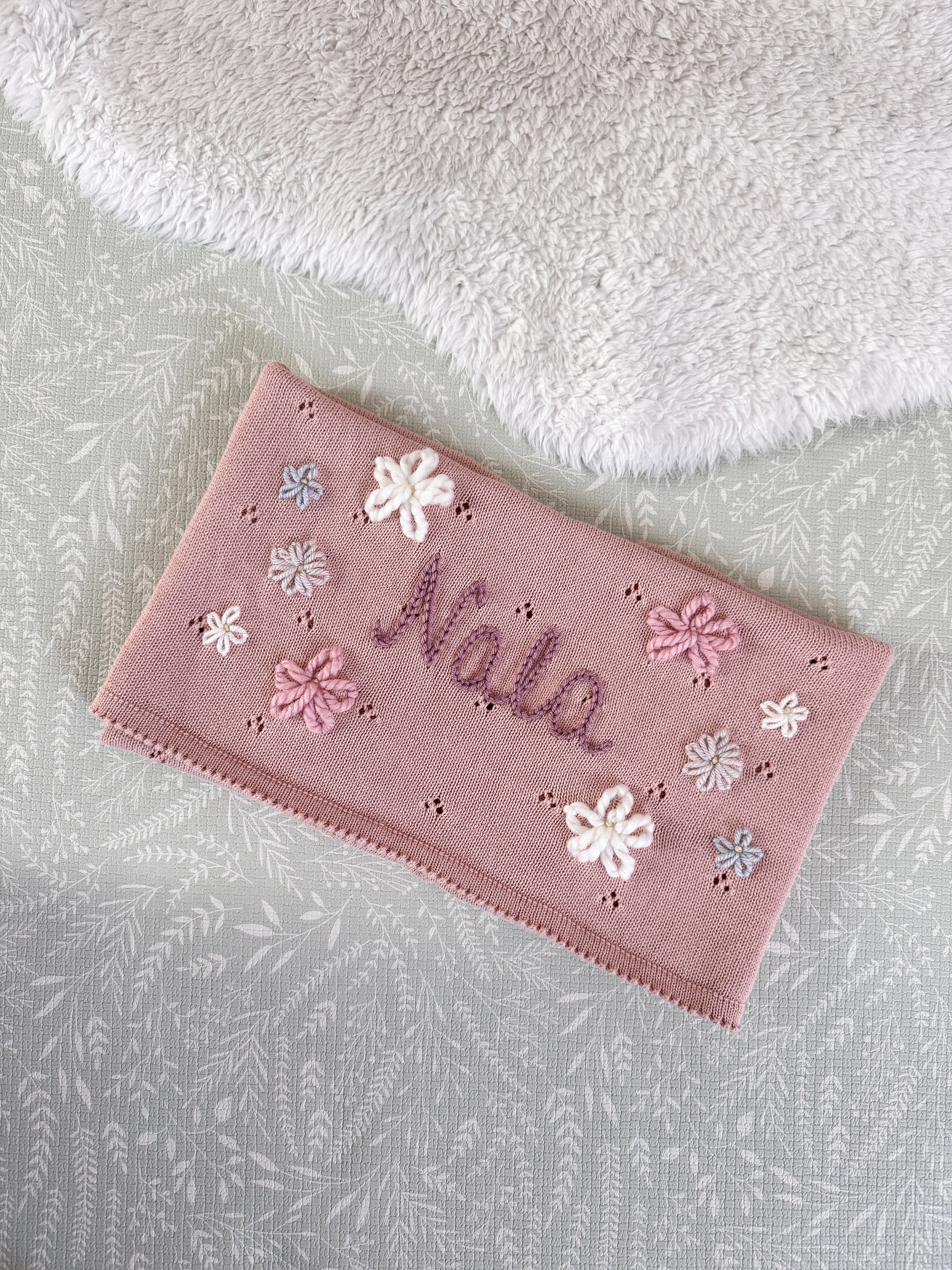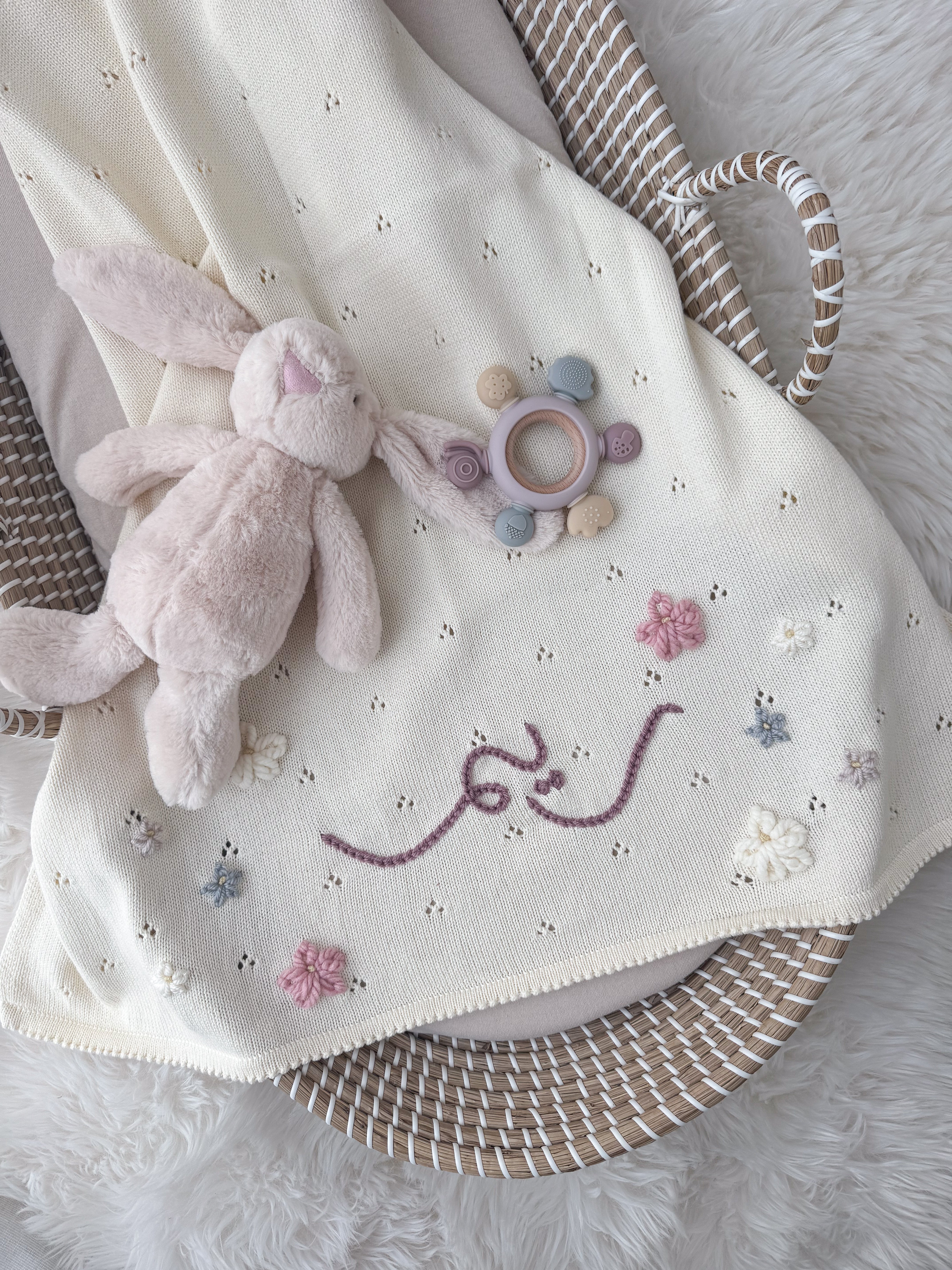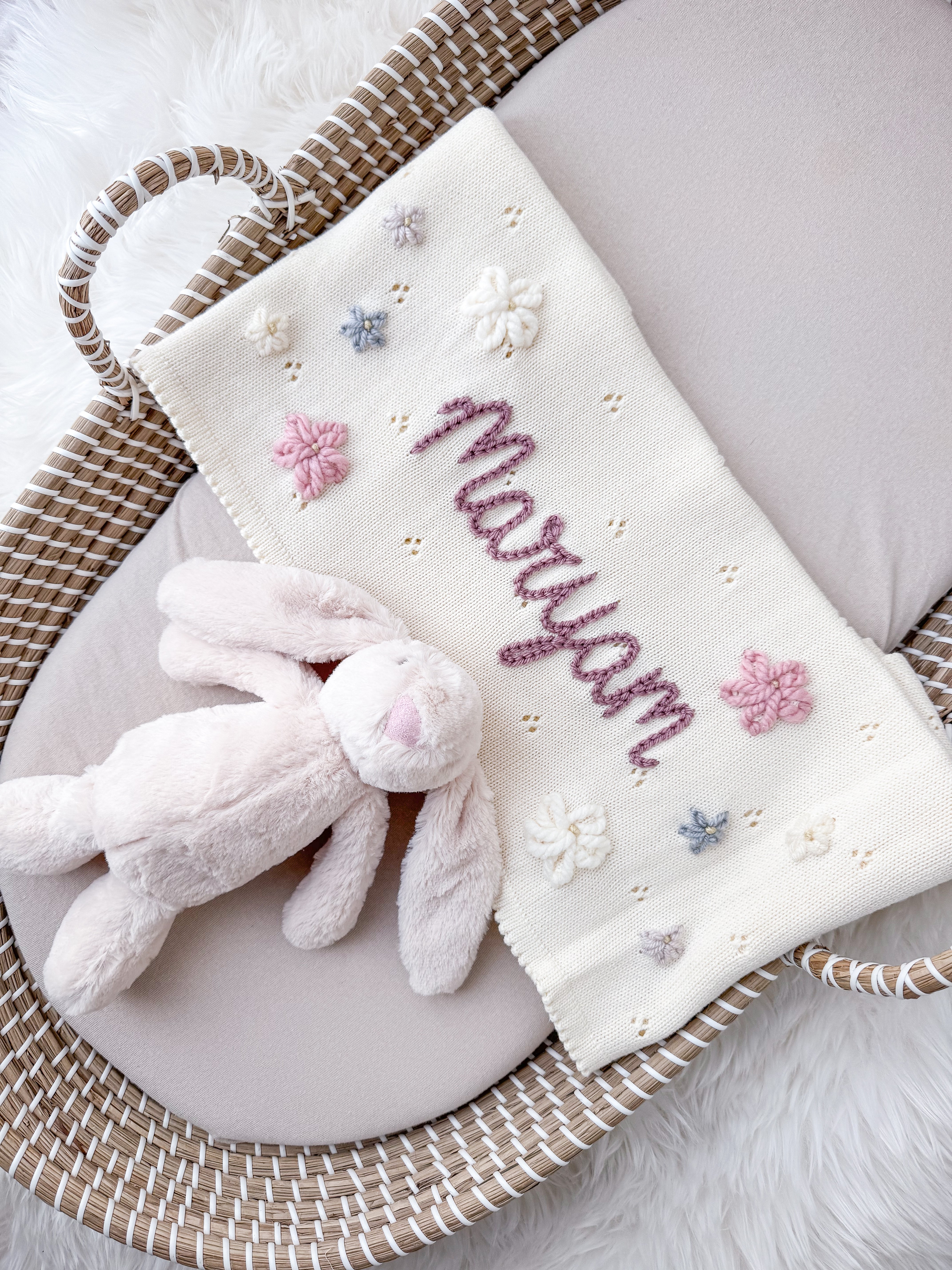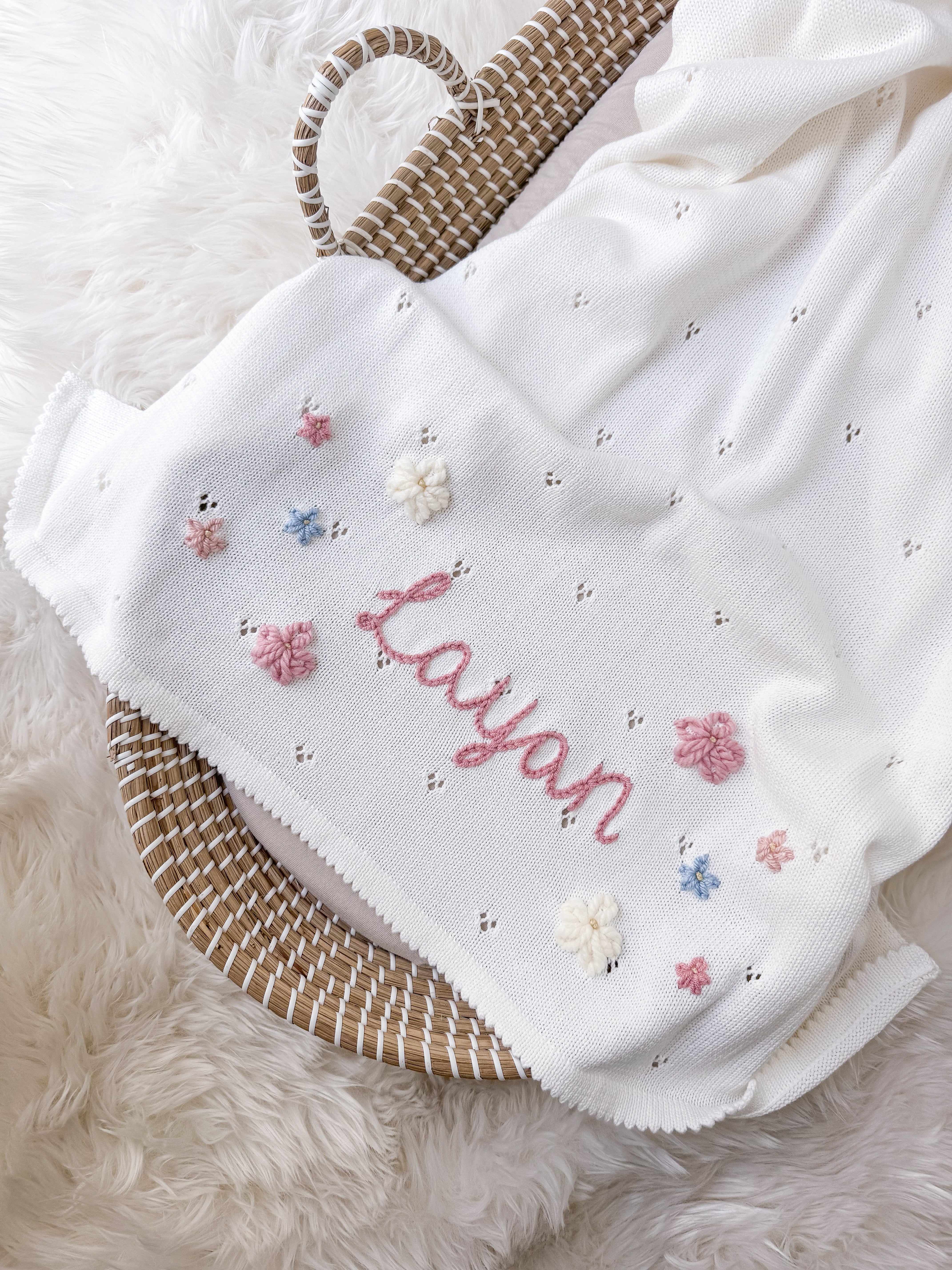 Names are hand-embroidered and are sewn along the bottom centre of the blanket, if you would like the name to be placed in another position on the blanket, please let us know in order notes box below.