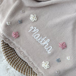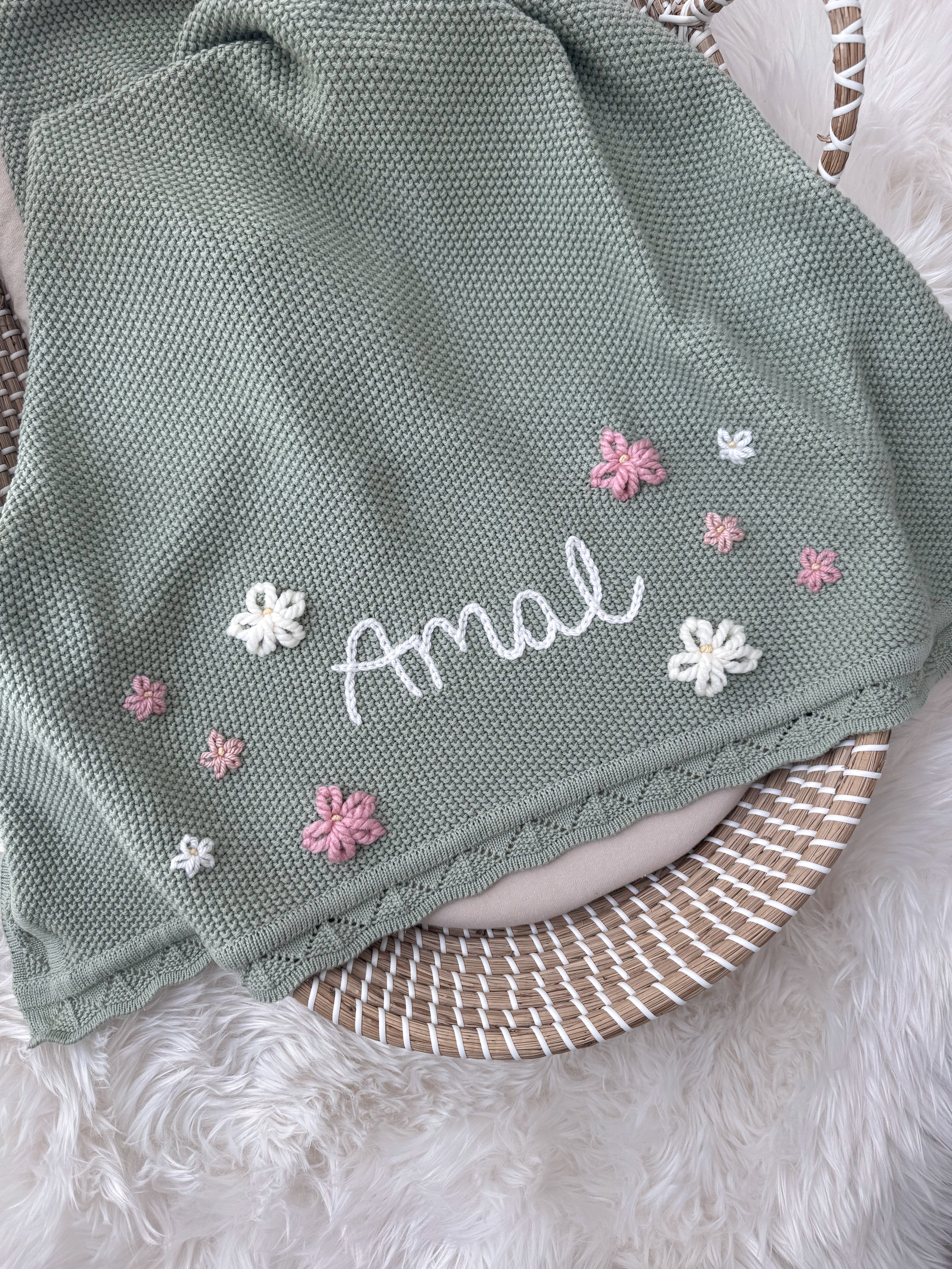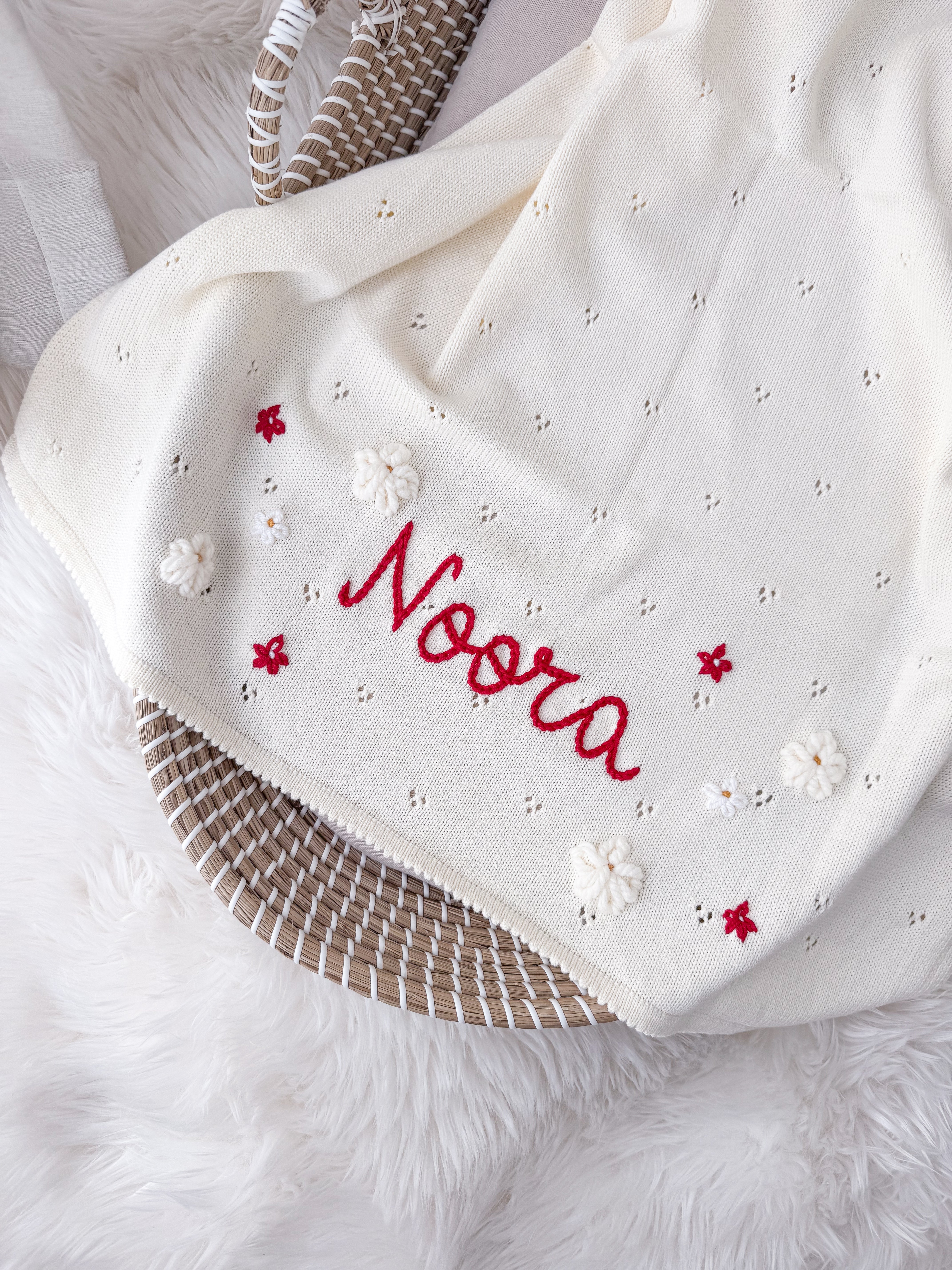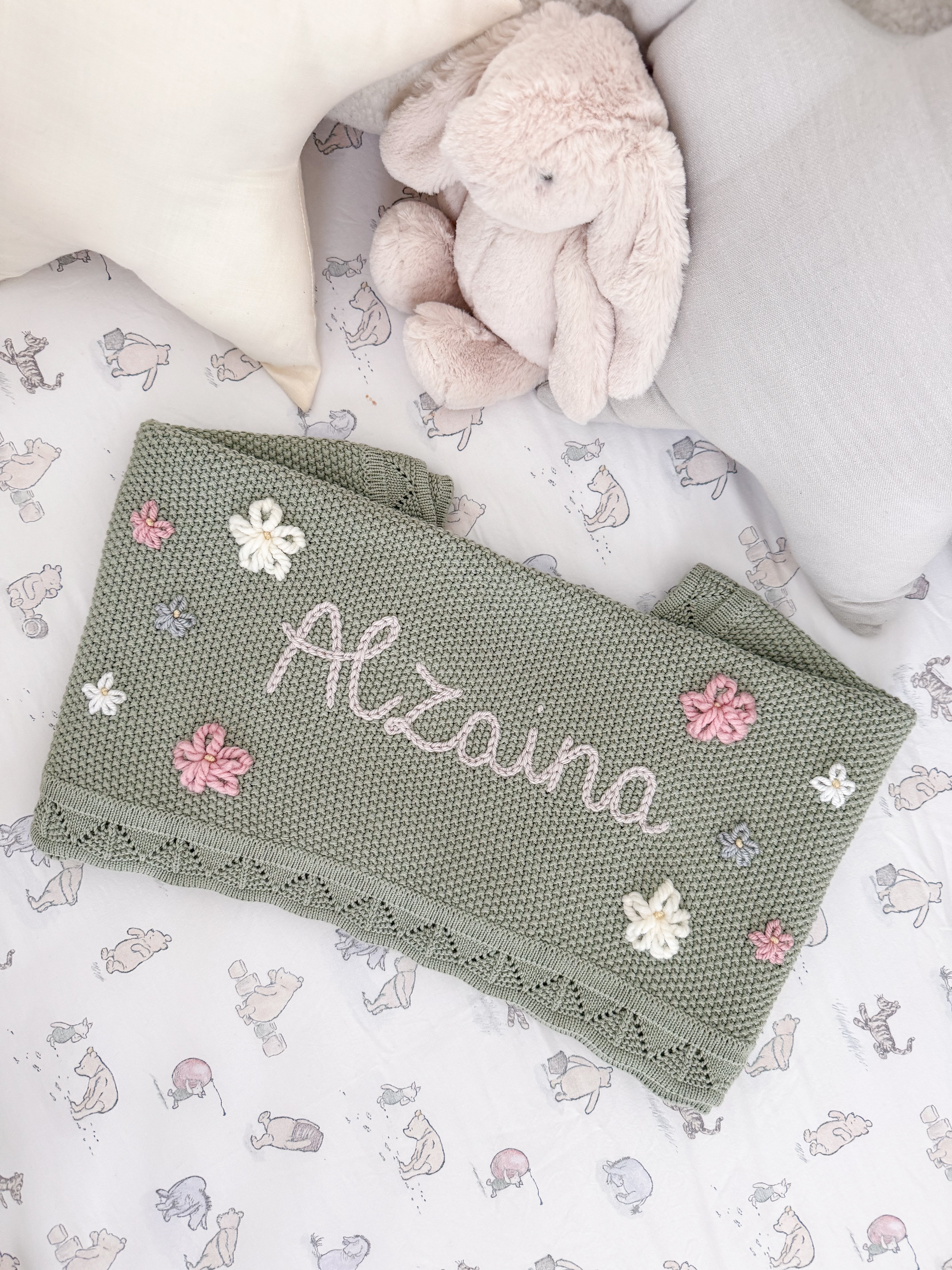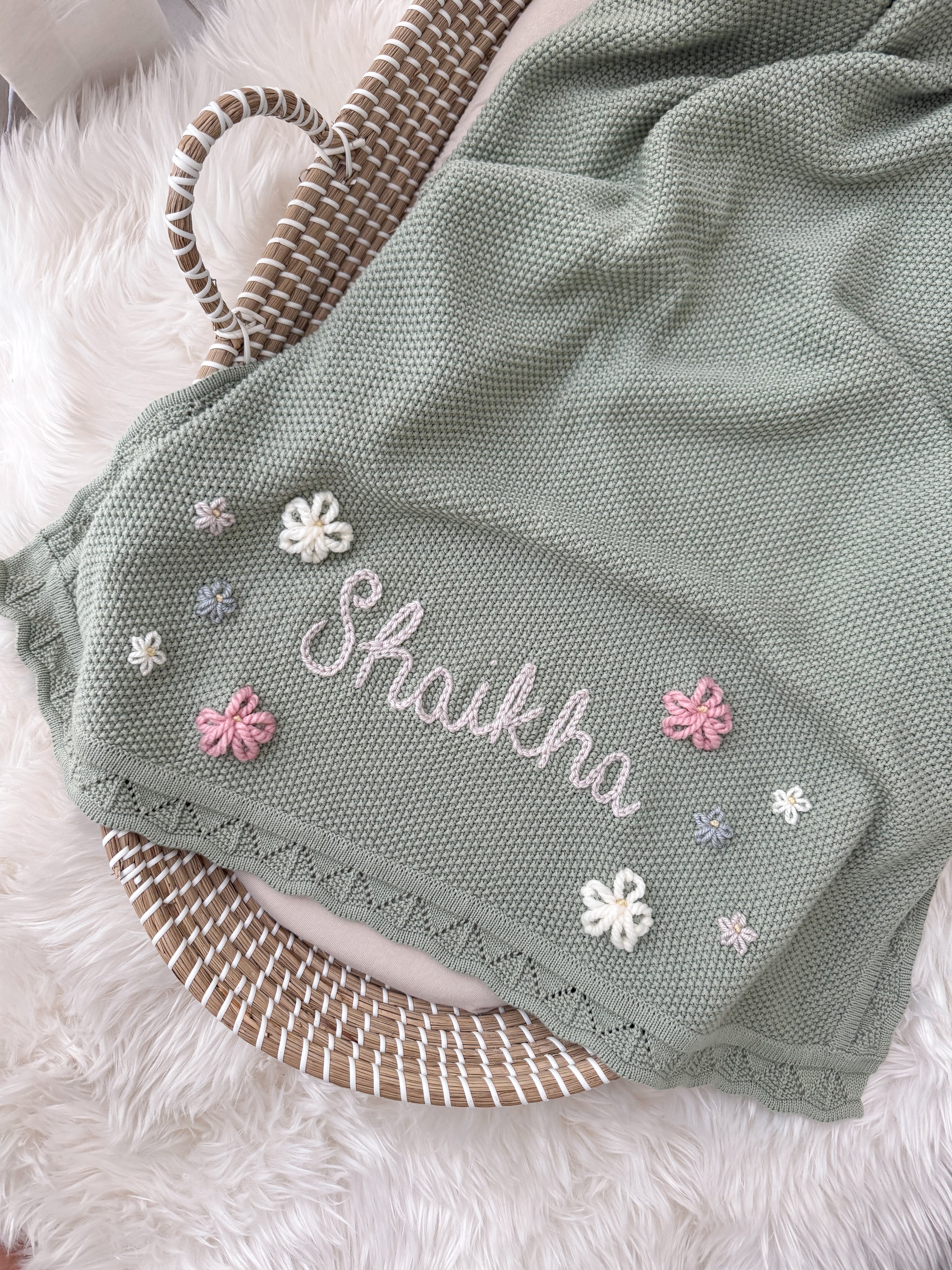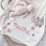 Names are hand-embroidered and are sewn along the bottom centre of the blanket, if you would like the name to be placed in another position on the blanket, please let us know in order notes box below.