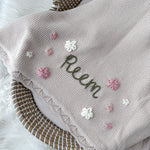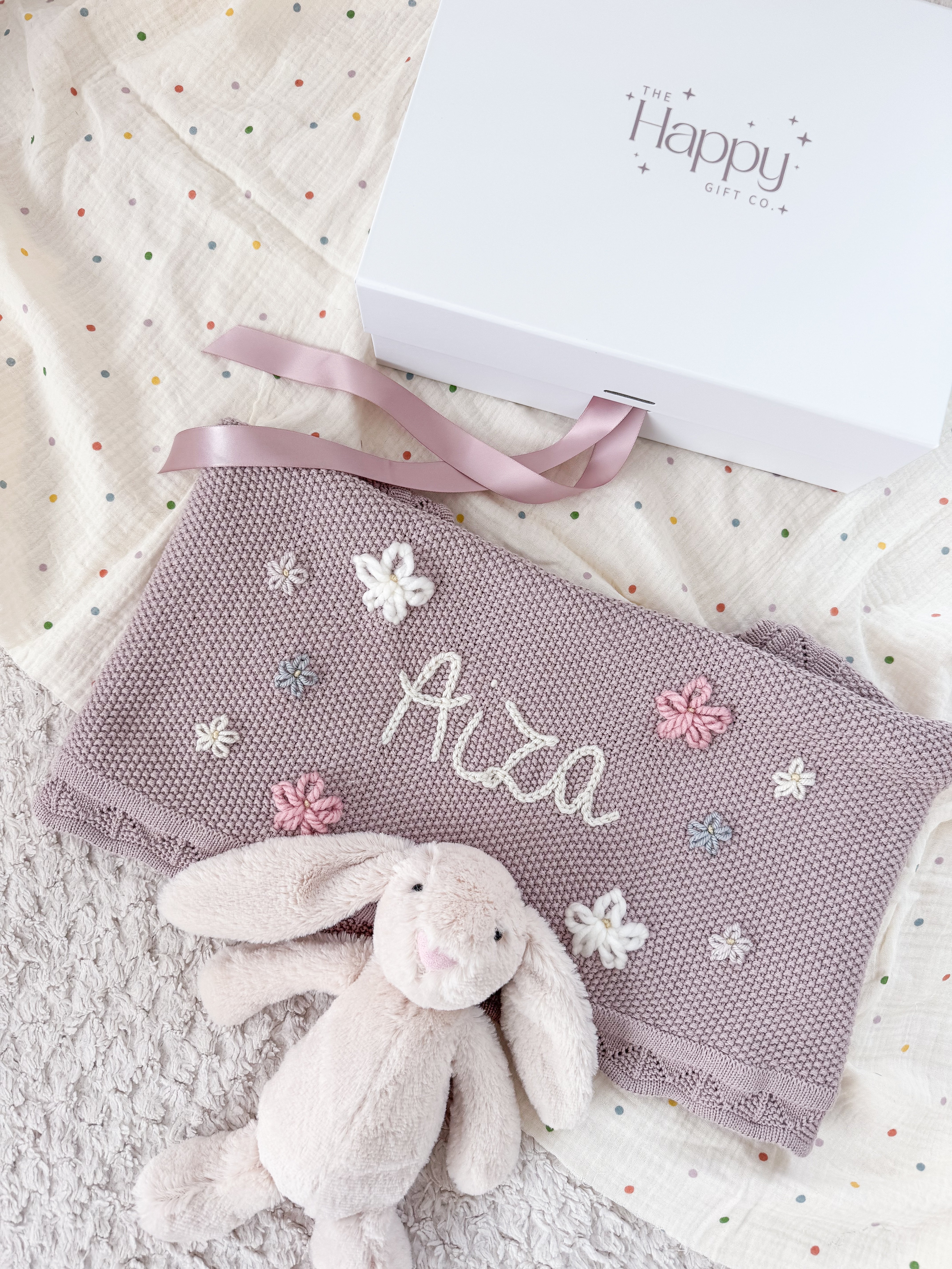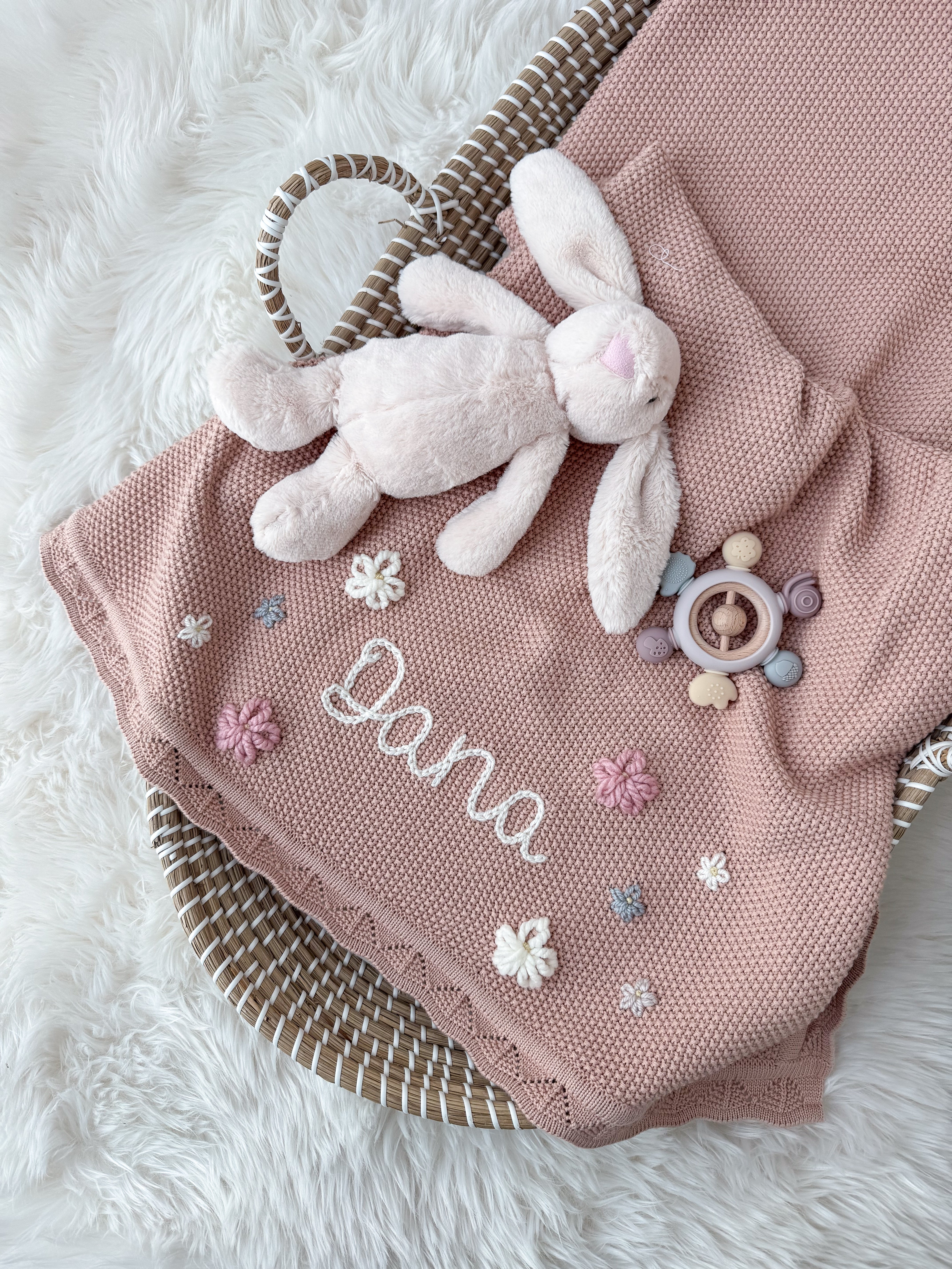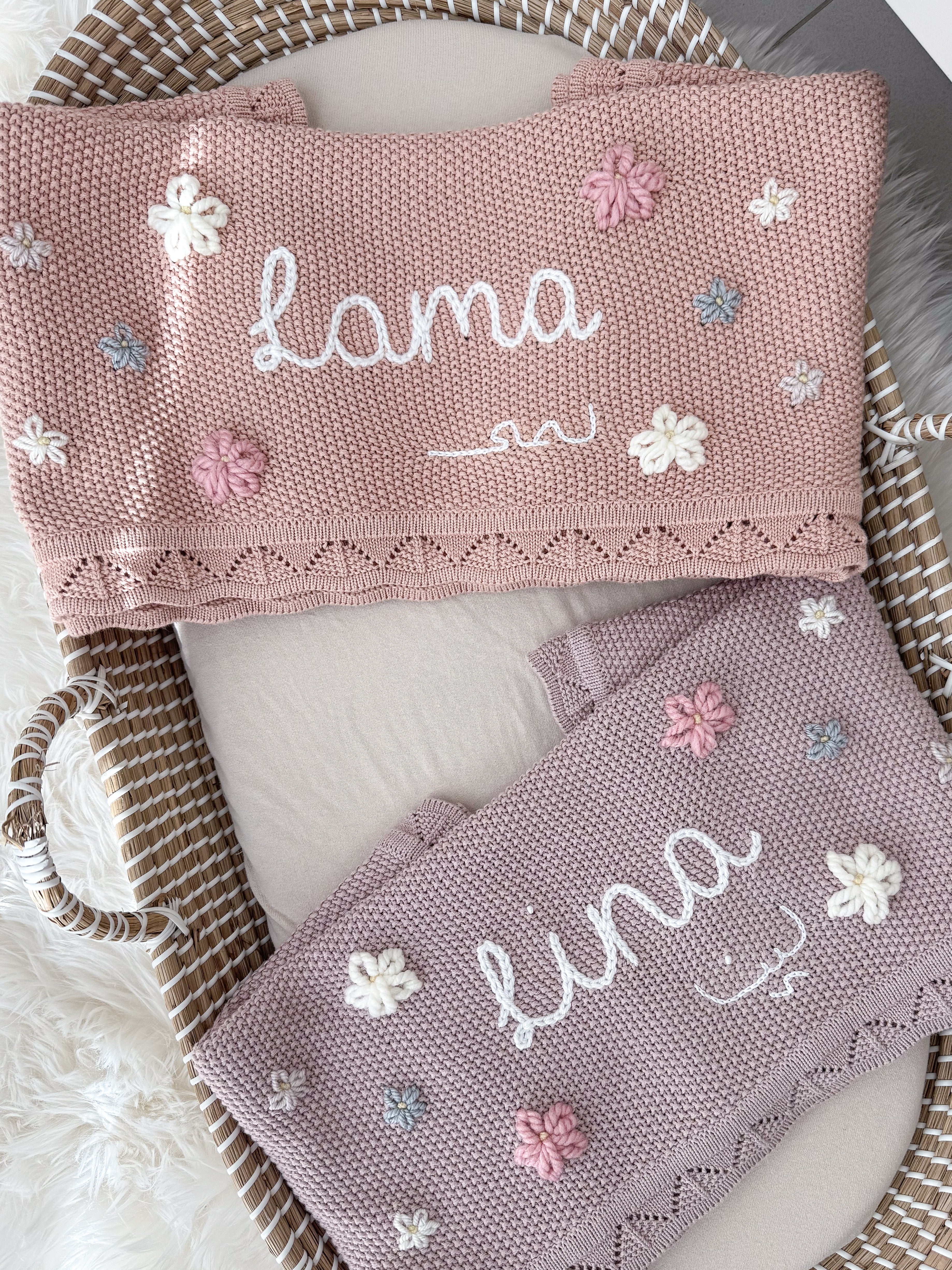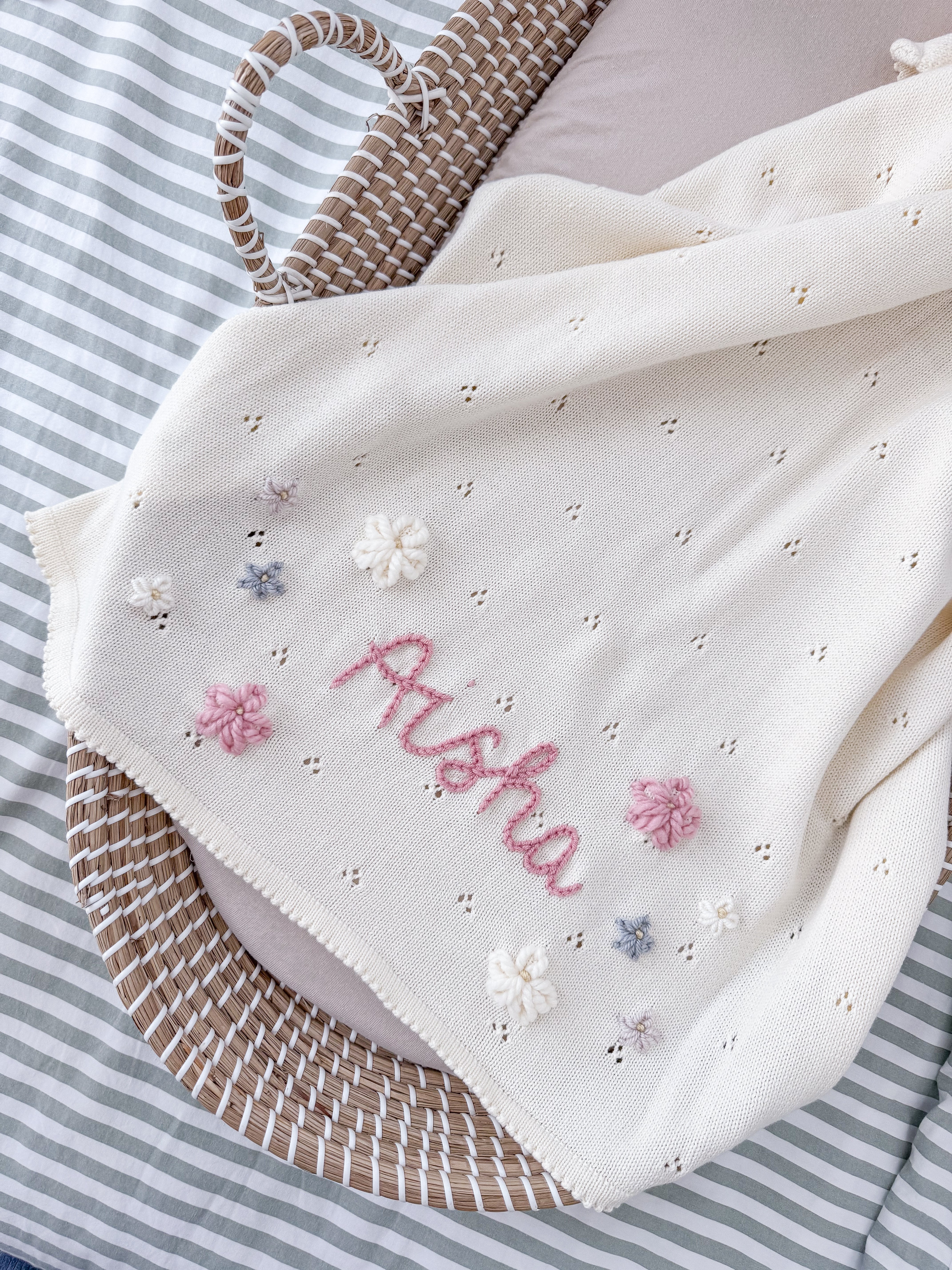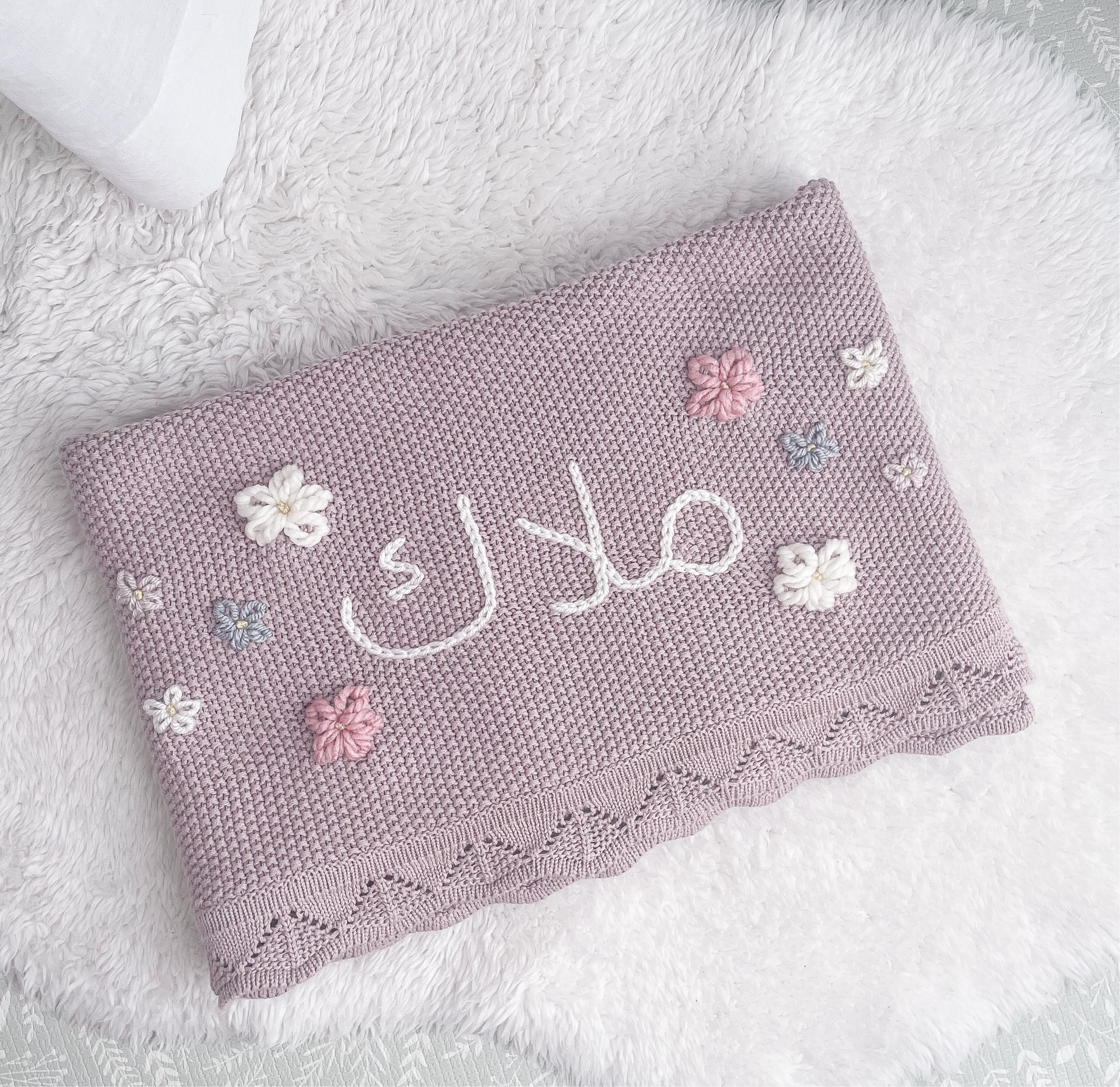Names are hand-embroidered and are sewn along the bottom centre of the blanket, if you would like the name to be placed in another position on the blanket, please let us know in order notes box below.