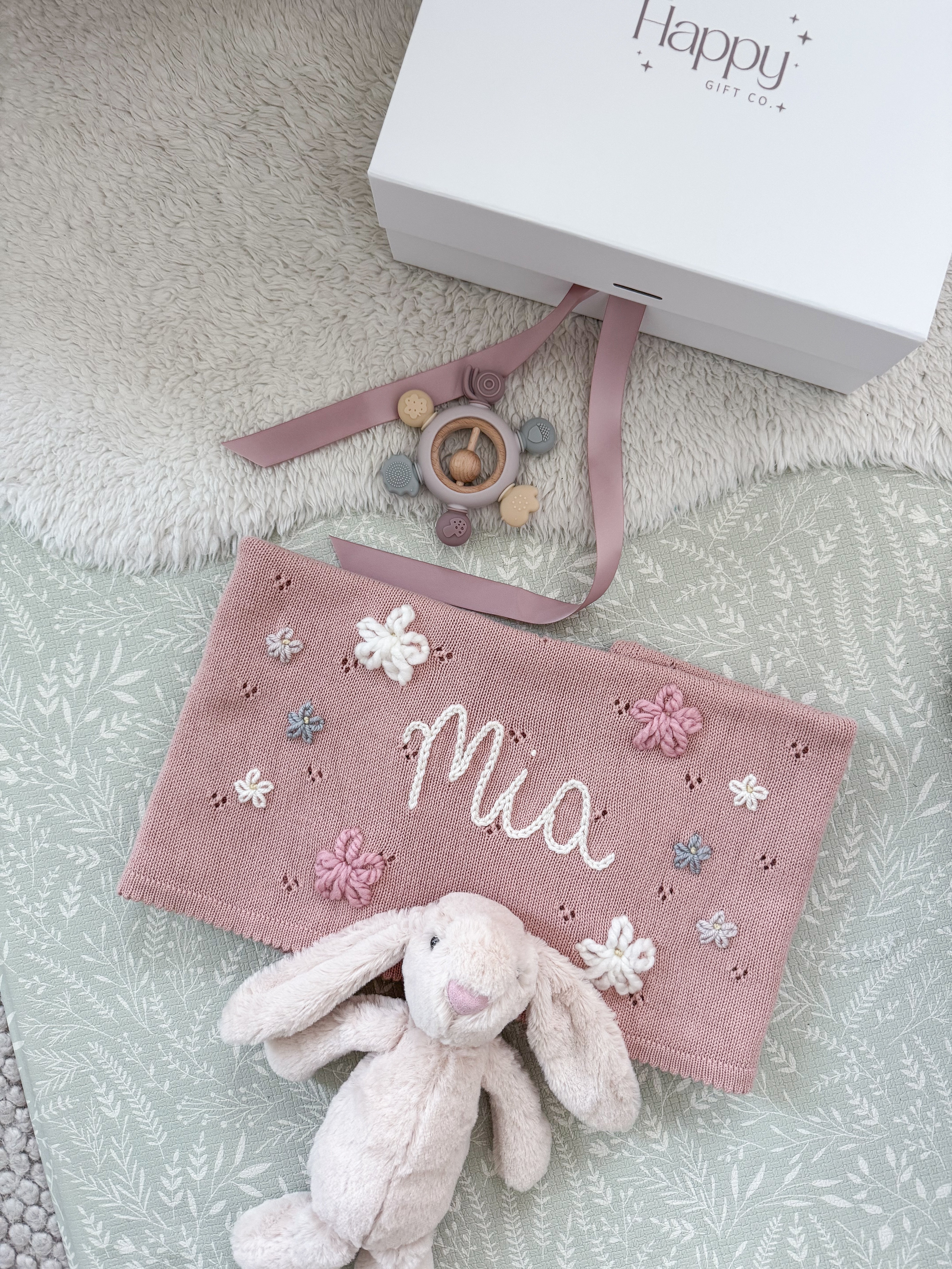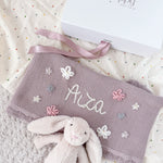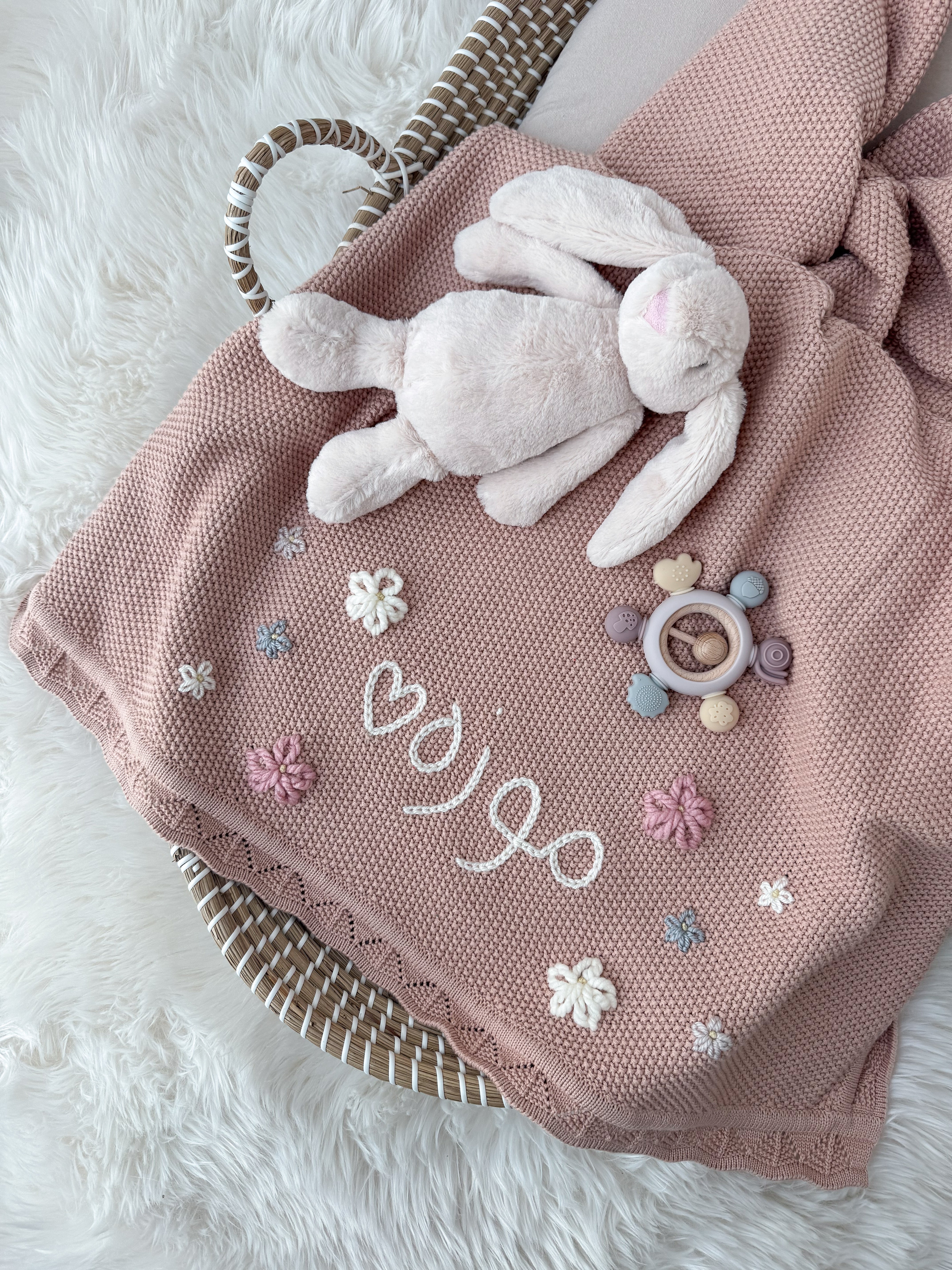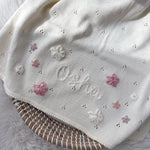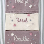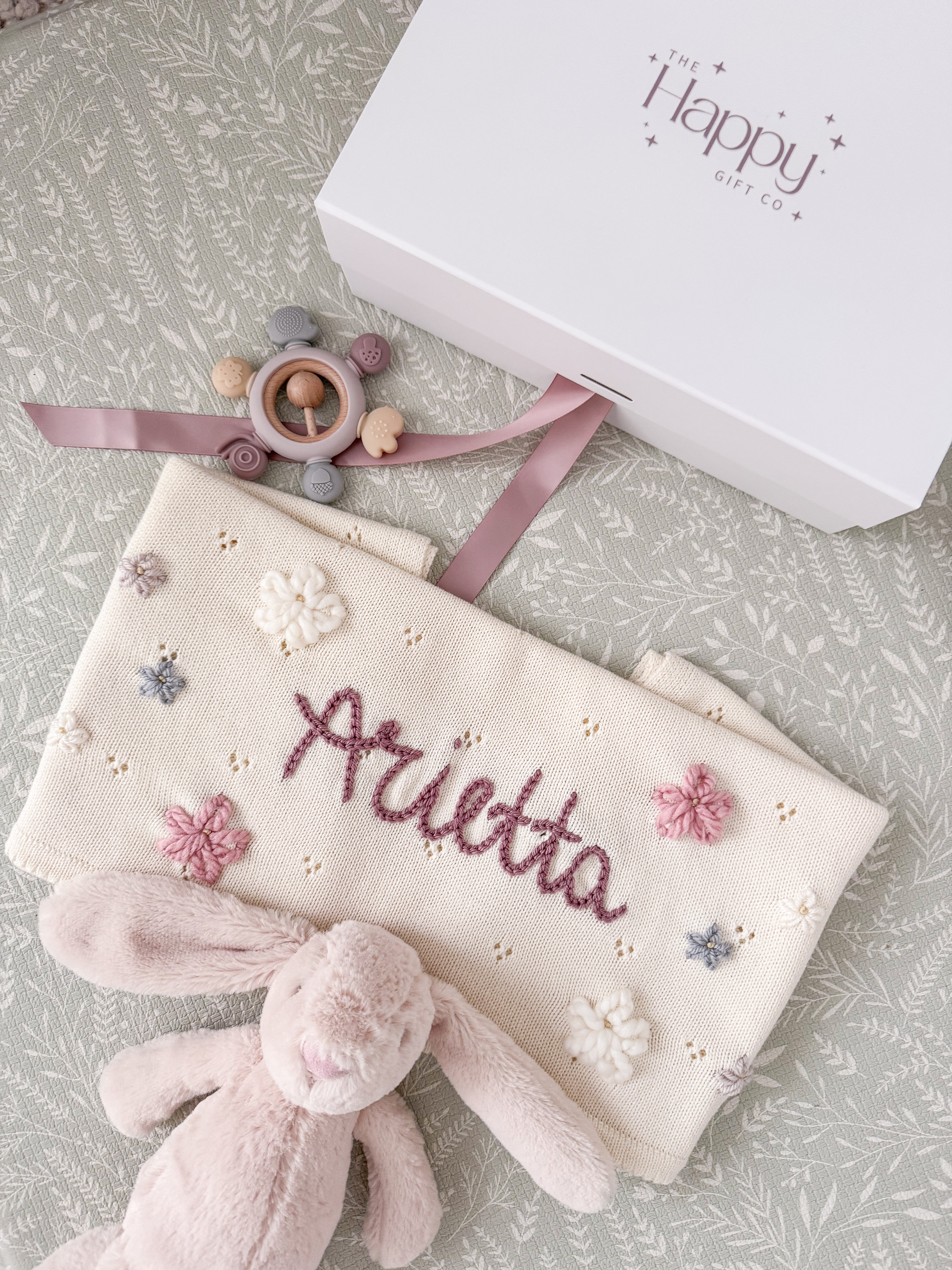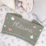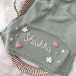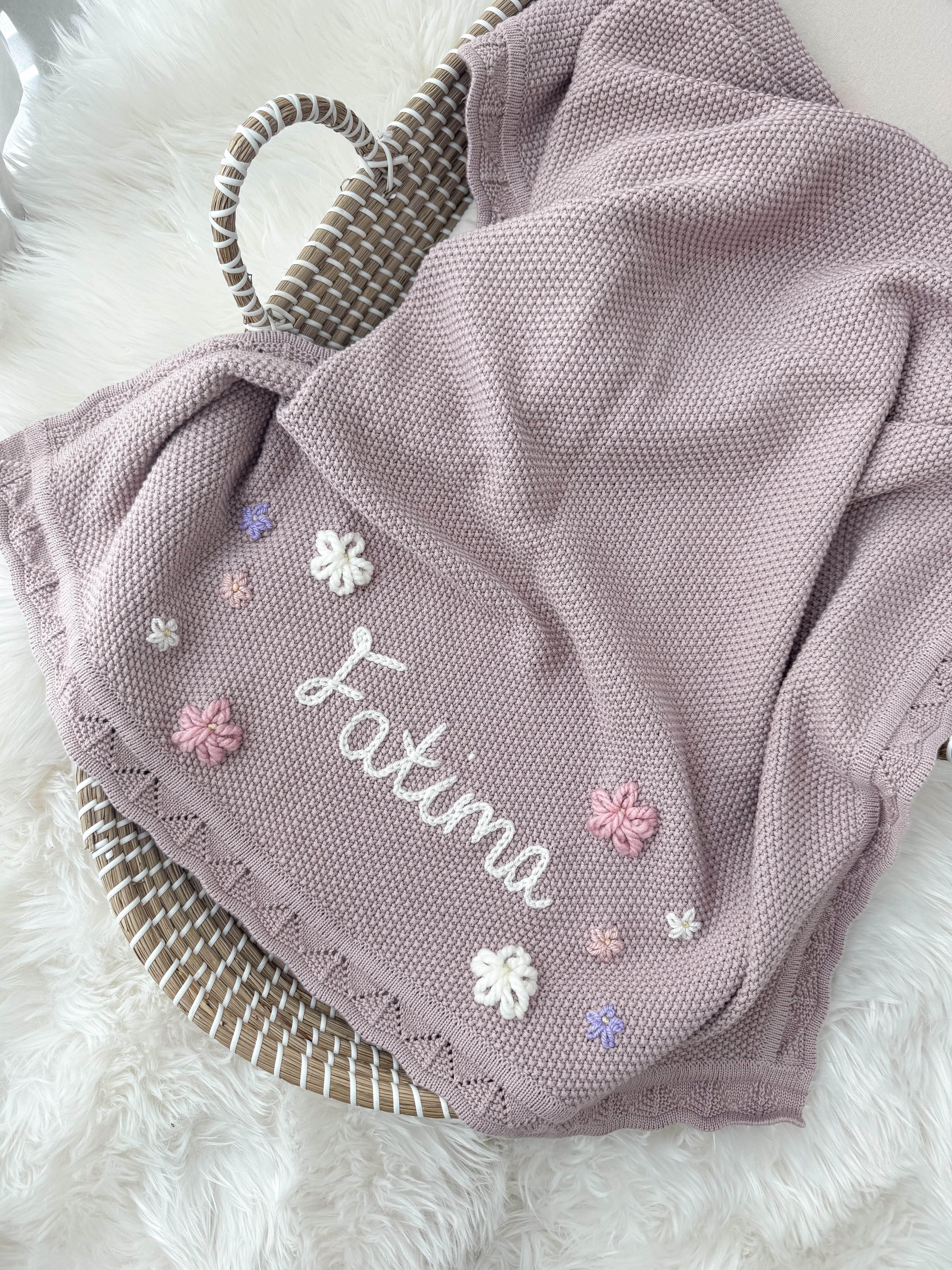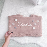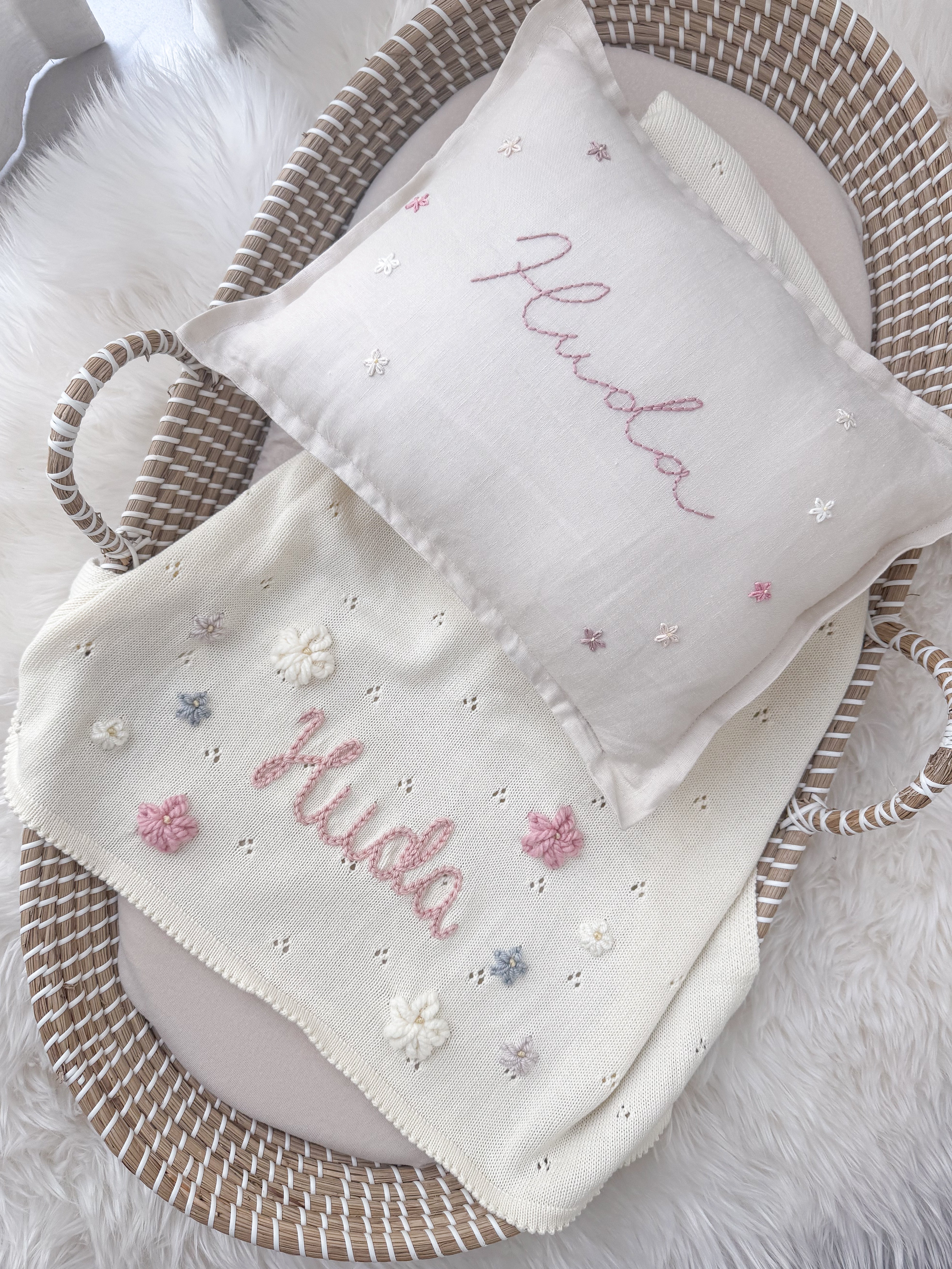 Names are hand-embroidered and are sewn along the bottom centre of the blanket, if you would like the name to be placed in another position on the blanket, please let us know in order notes box below.