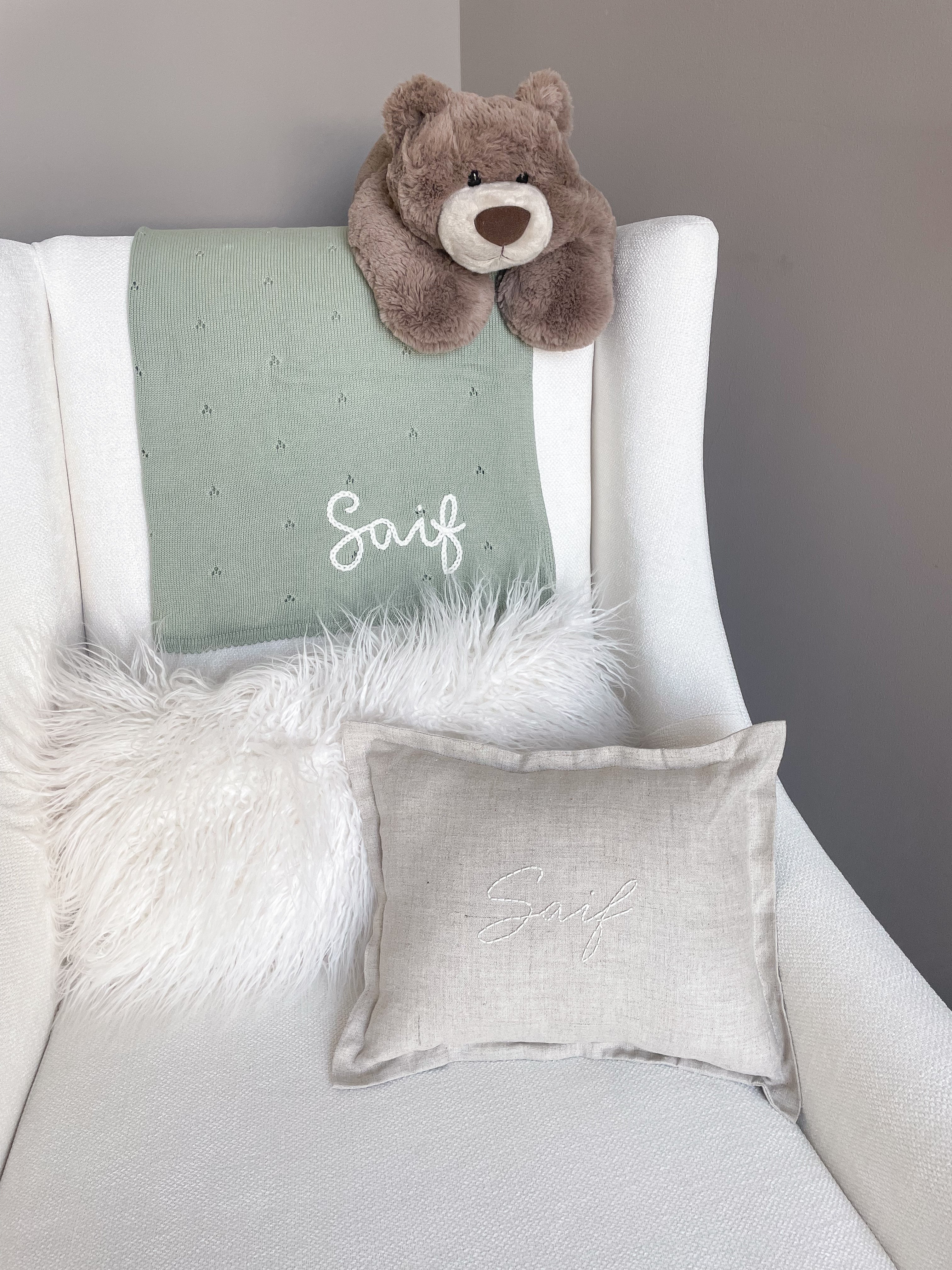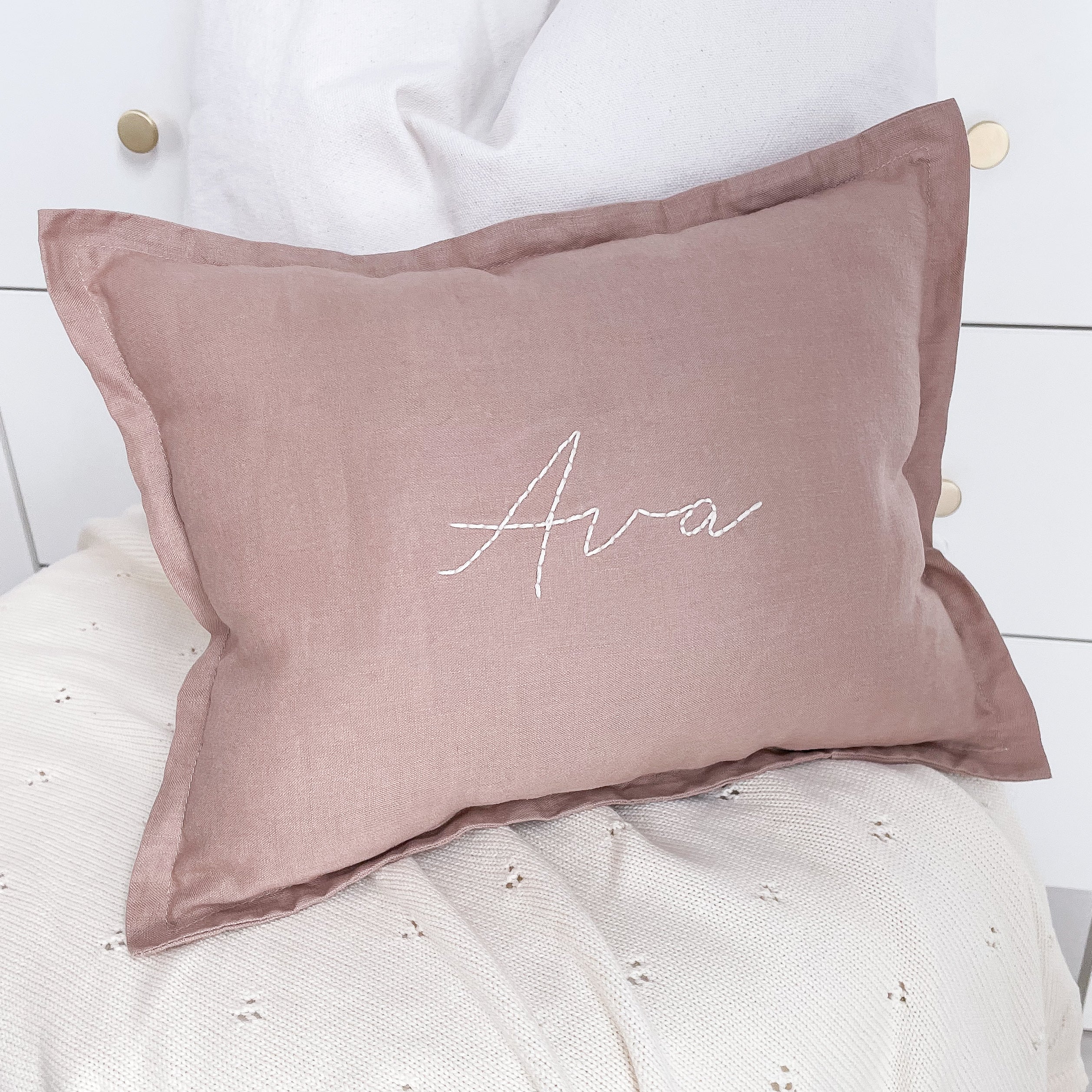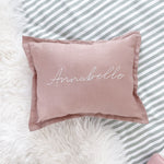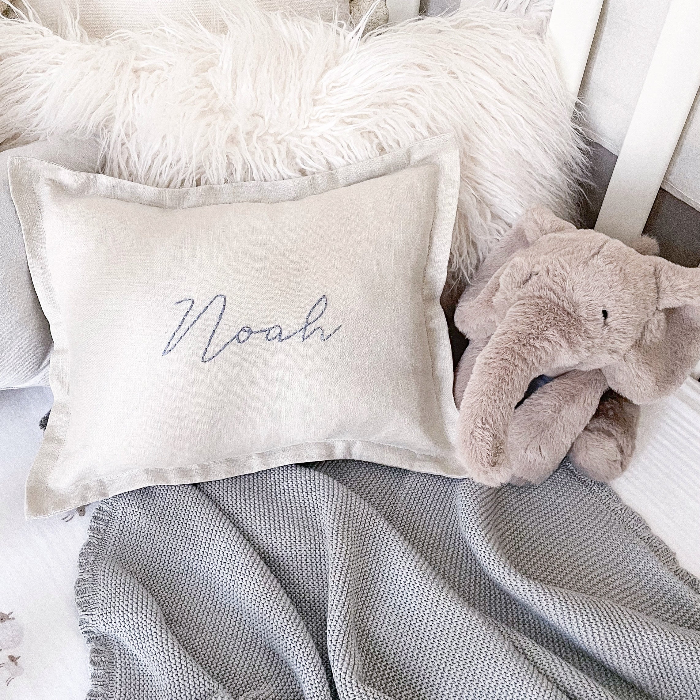 Give your nursery a special and unique touch with our handmade linen cushion, adorned with your child's name in beautiful hand-embroidered script. Its soft frayed trim makes this the perfect finishing touch for any nursery.