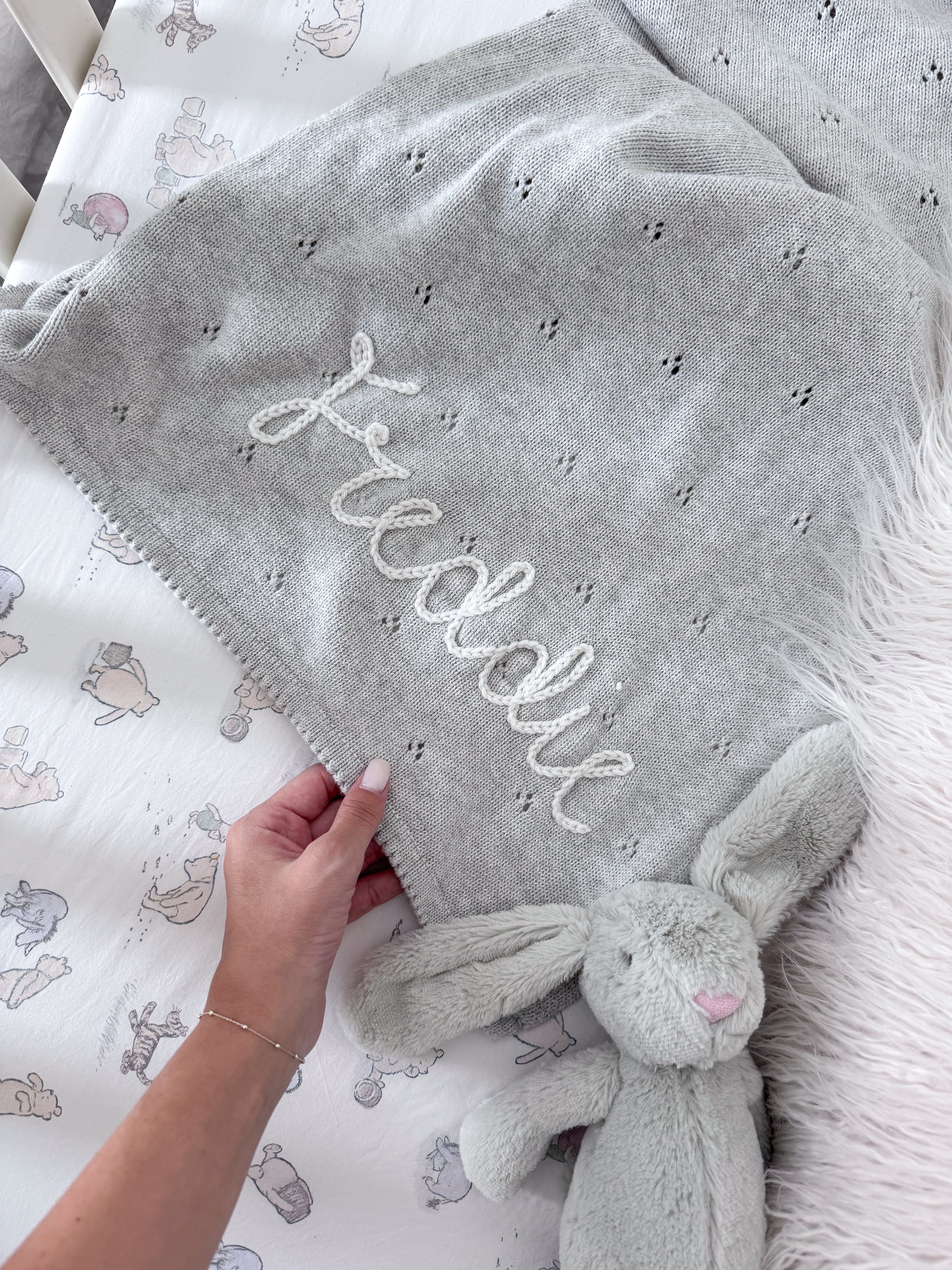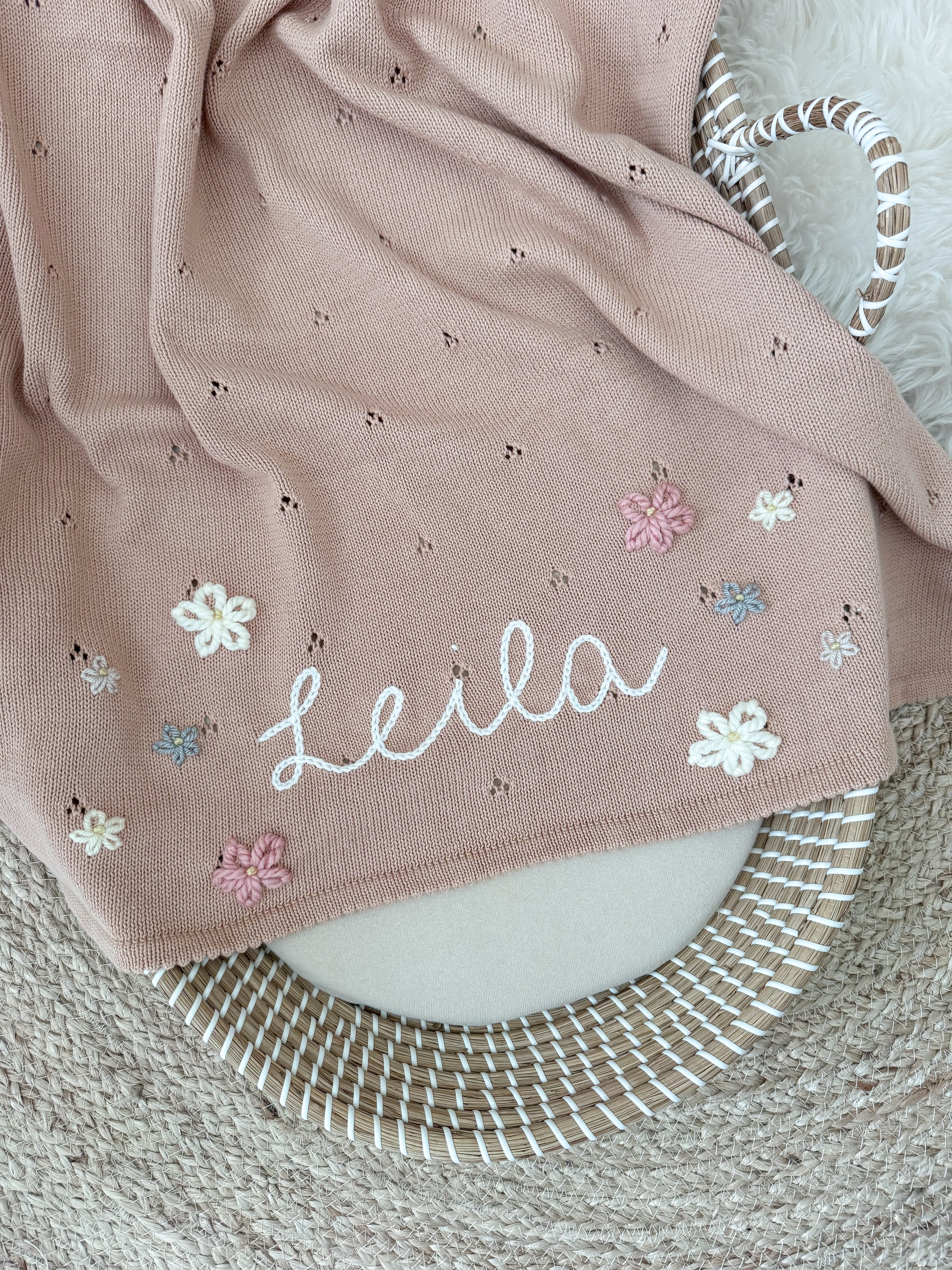 Names are hand-embroidered and are sewn on the bottom right hand side of the blanket, if you would like the name to be placed in another position on the blanket, please let us know in the order notes.